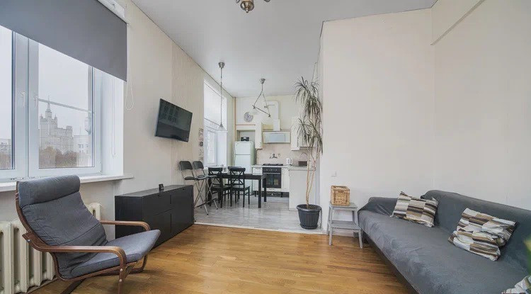 Уютная трехкомнатная квартира в доме на Краснопресненской набережной. Гостиная объединена с кухней, спальня, раздельный санузел. Кухня укомплектована бытовой техникой, газовая плита; в ванной установлена стиральная машина, в комнатах и коридоре установлены вместительные шкафы. Высокие окна выходят во двор и в сторону переулка, вид на Дом Правительства и высотку на Баррикадной, квартира очень светлая.
