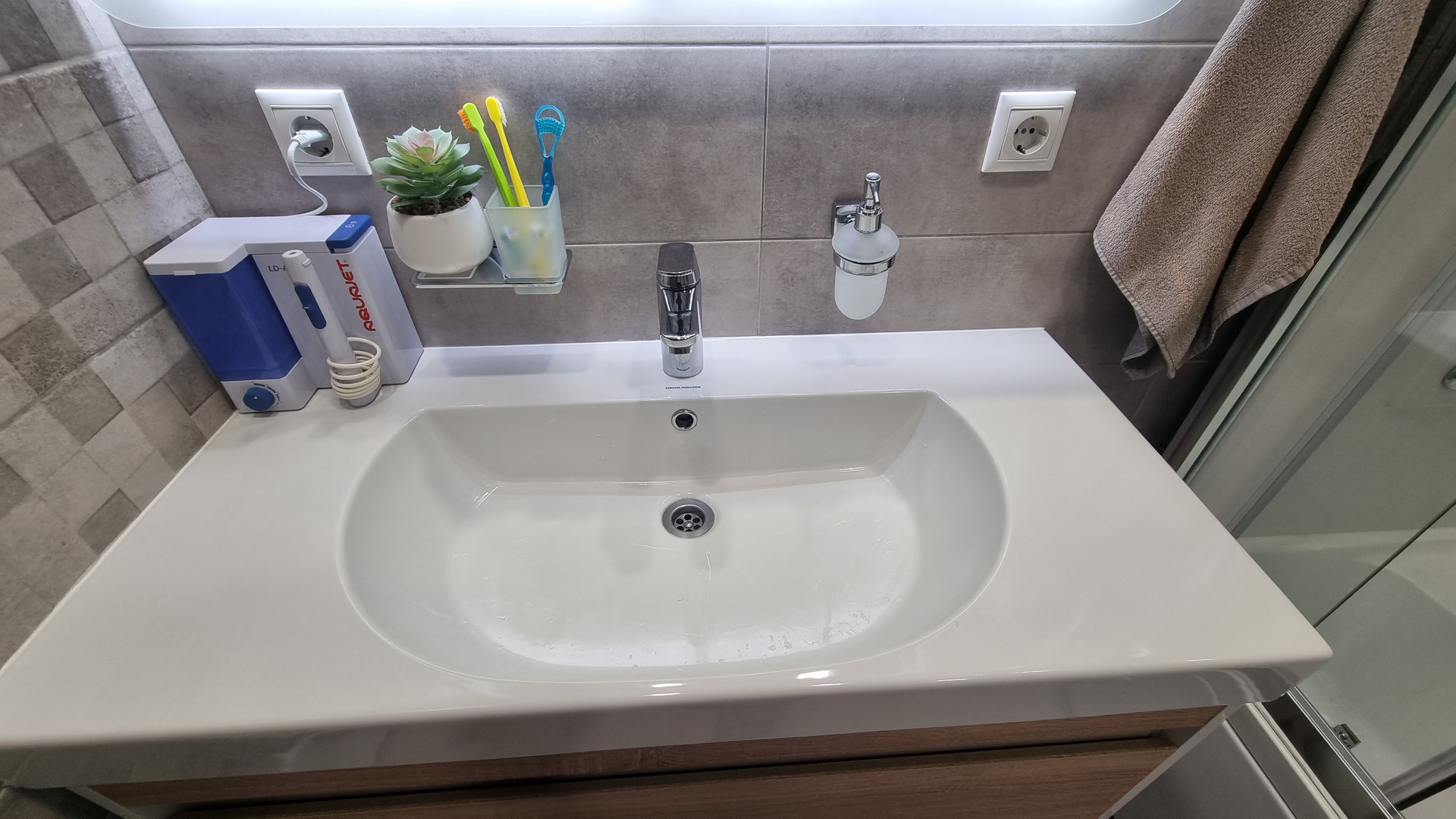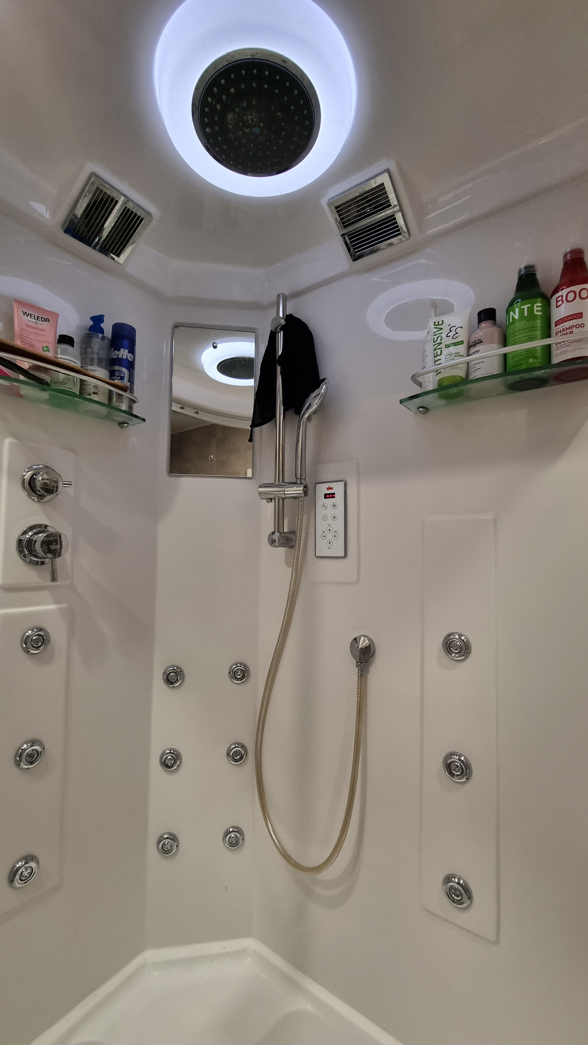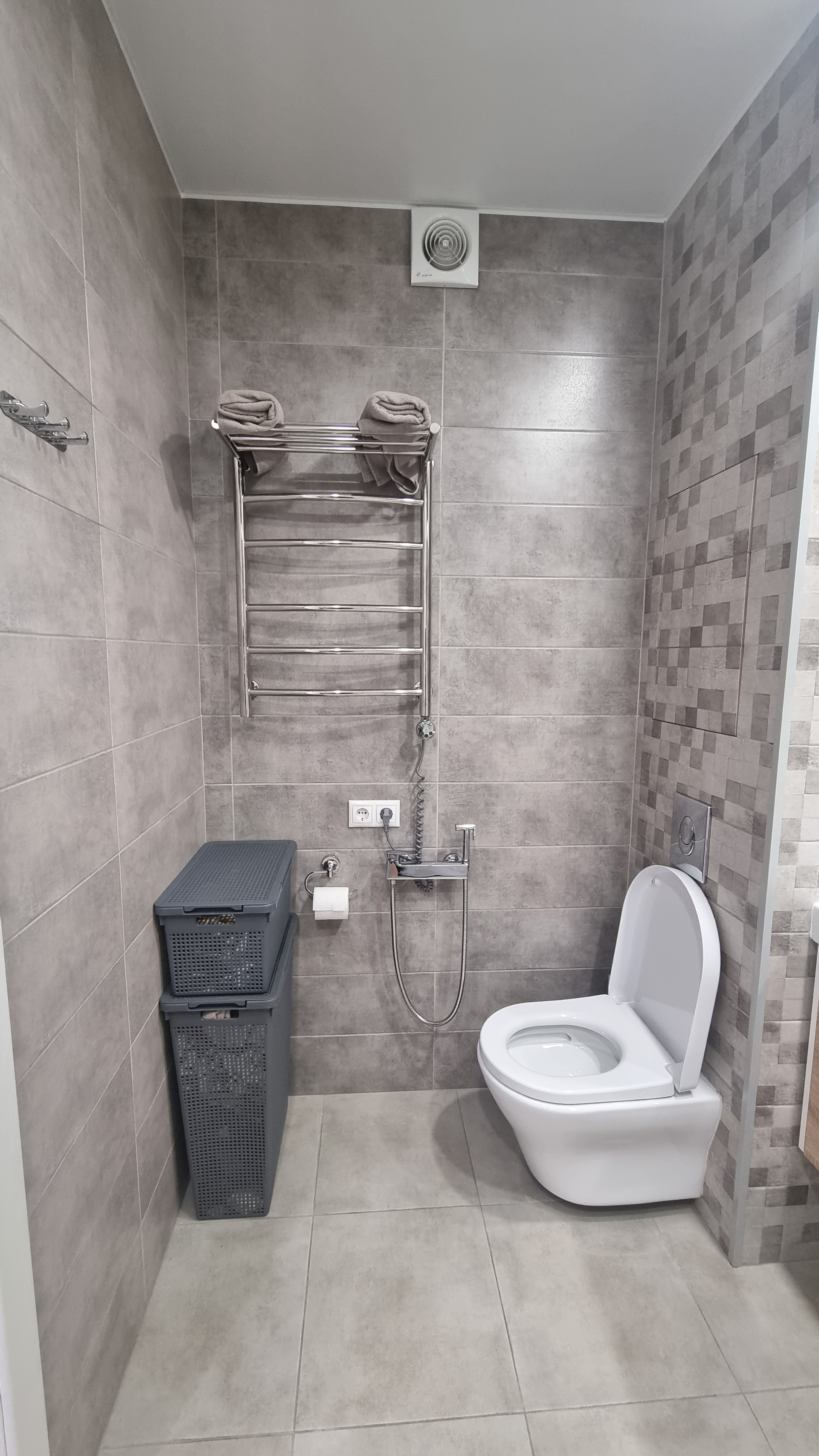 В санузле стоит качественная душевая кабина от Timo с подсветкой и радио, установлены классный японский безободковый унитаз от Toto (инсталяция) и очень удобная подвесная тумба с раковиной Kerama Marazzi (с широкими крыльями), сантехника Grohe.