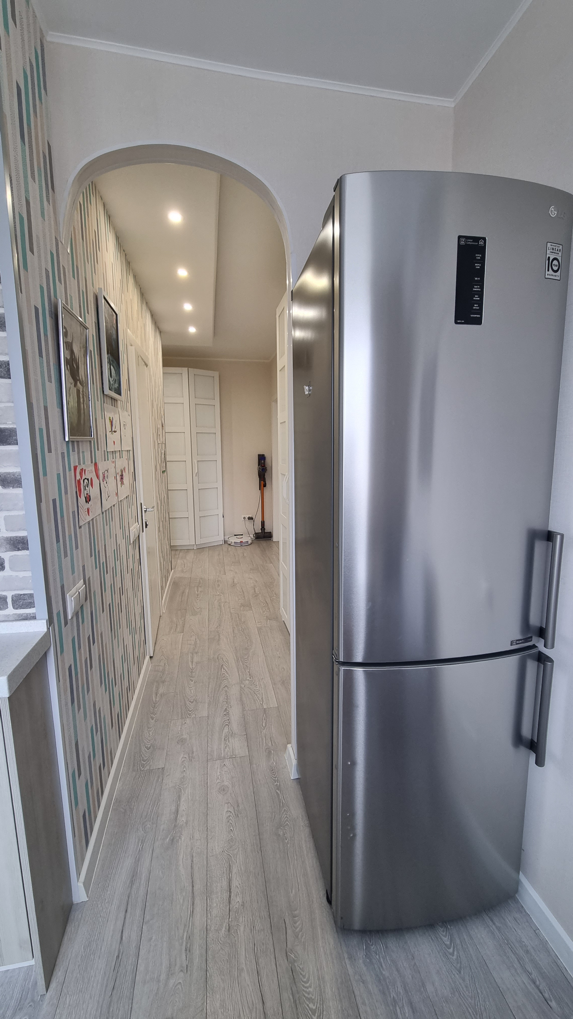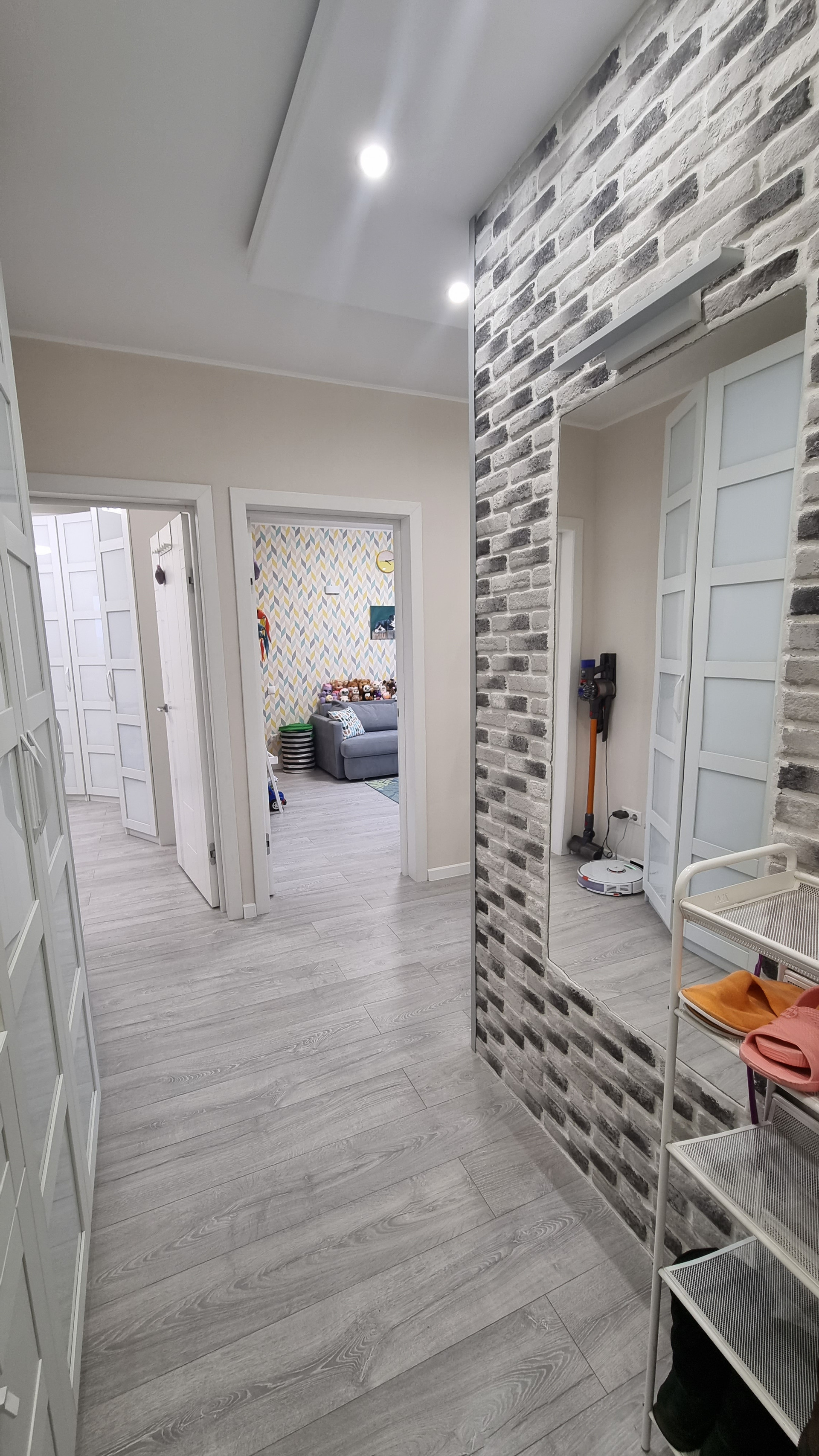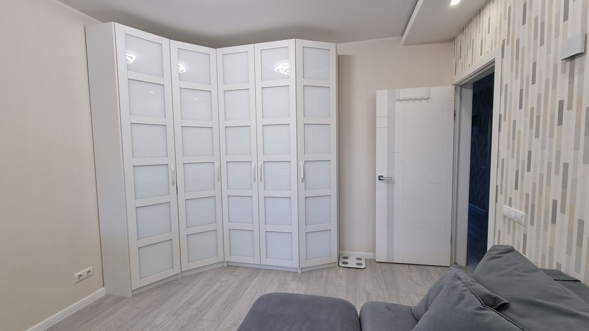 Квартира очень светлая, уютная, в ней присутствует разный вид светодиоидного освещения: и основной в виде спотов, люстр, и скрытое освещение (лента), и светильники на стенах.