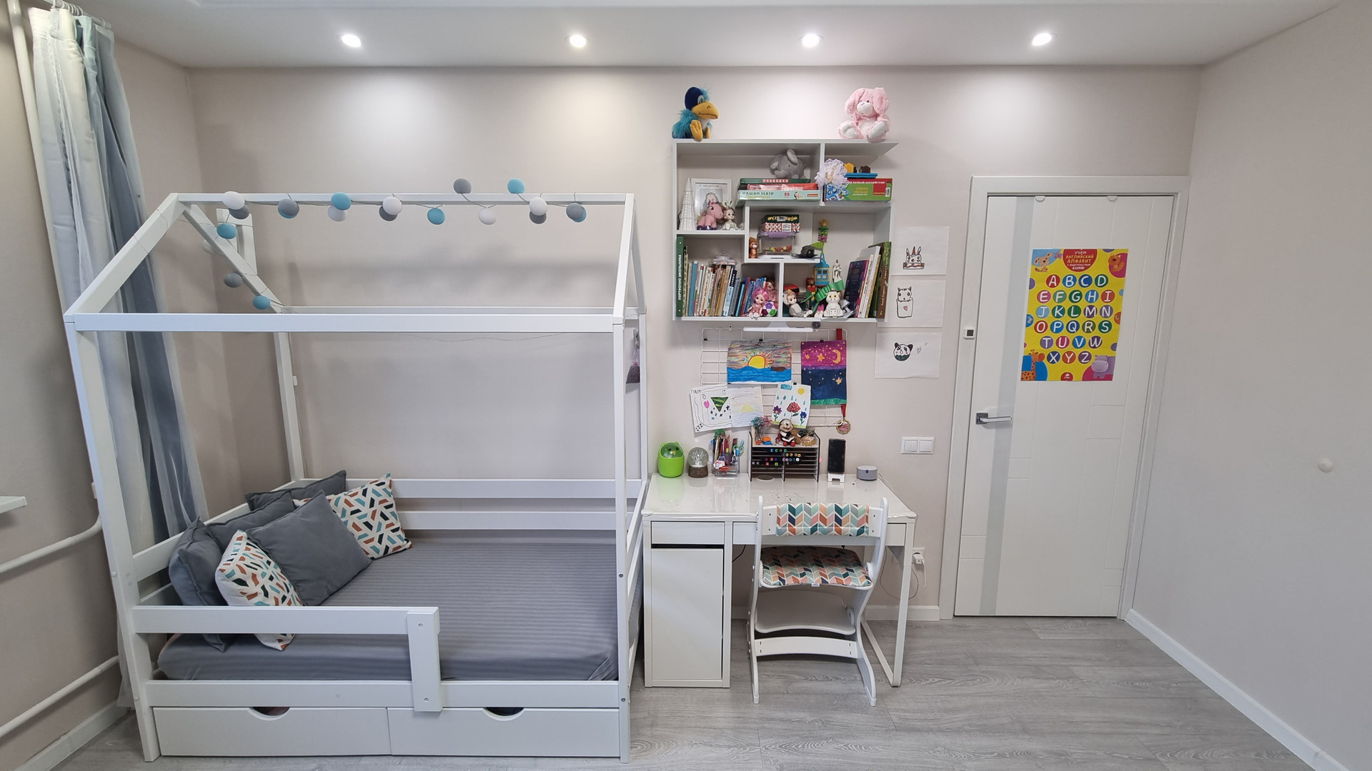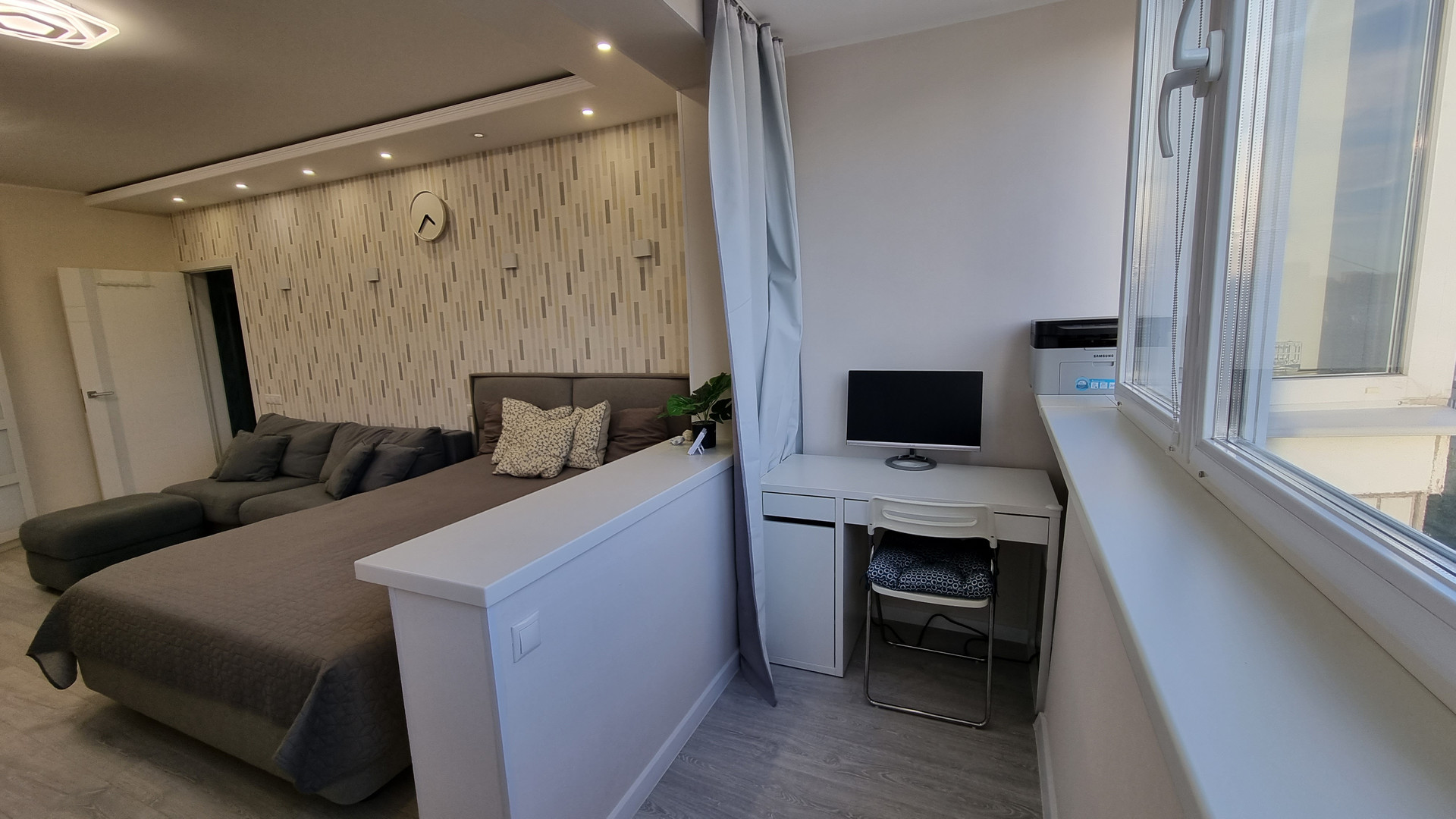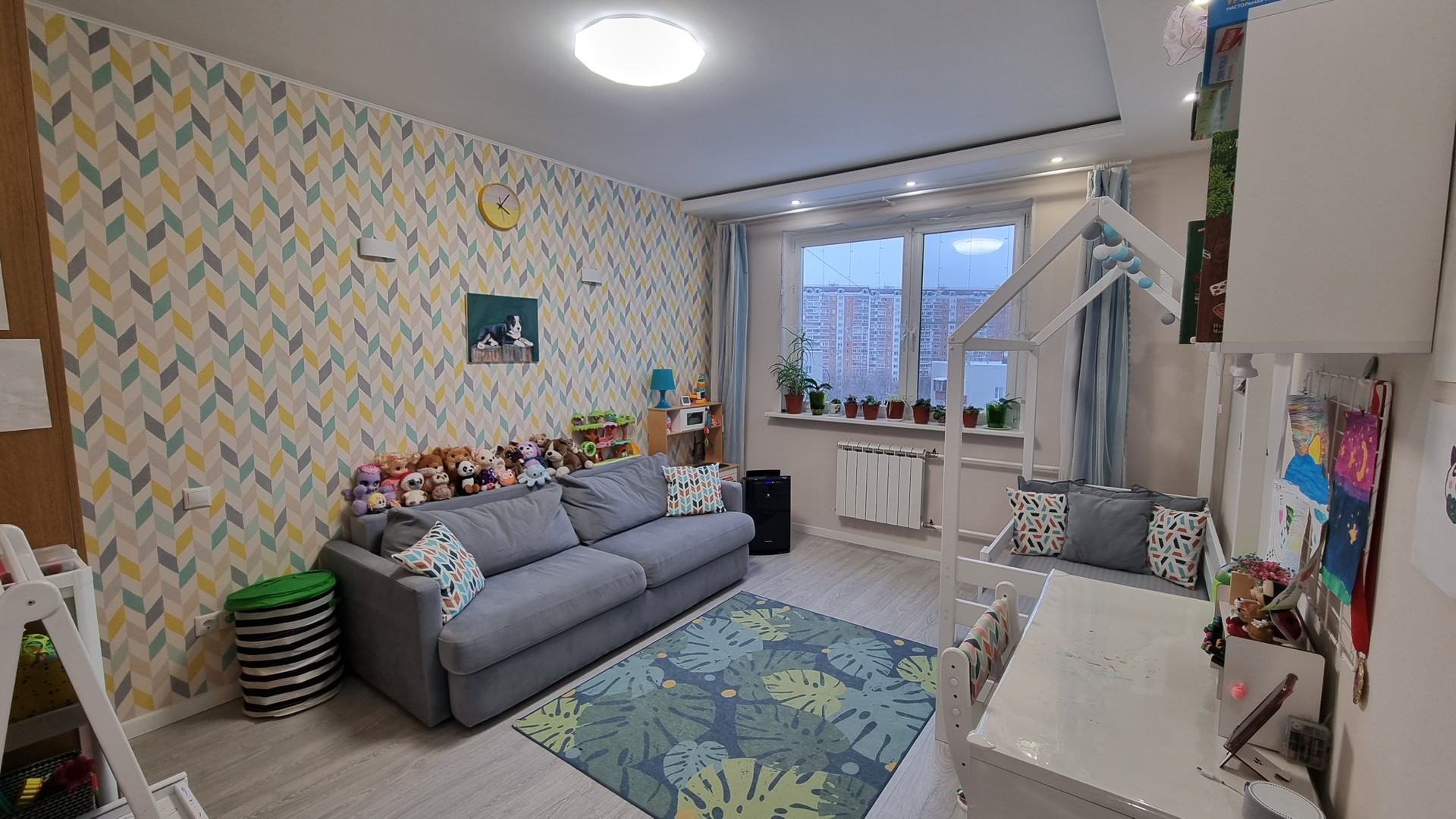 Квартира очень светлая, уютная, в ней присутствует разный вид светодиоидного освещения: и основной в виде спотов, люстр, и скрытое освещение (лента), и светильники на стенах.