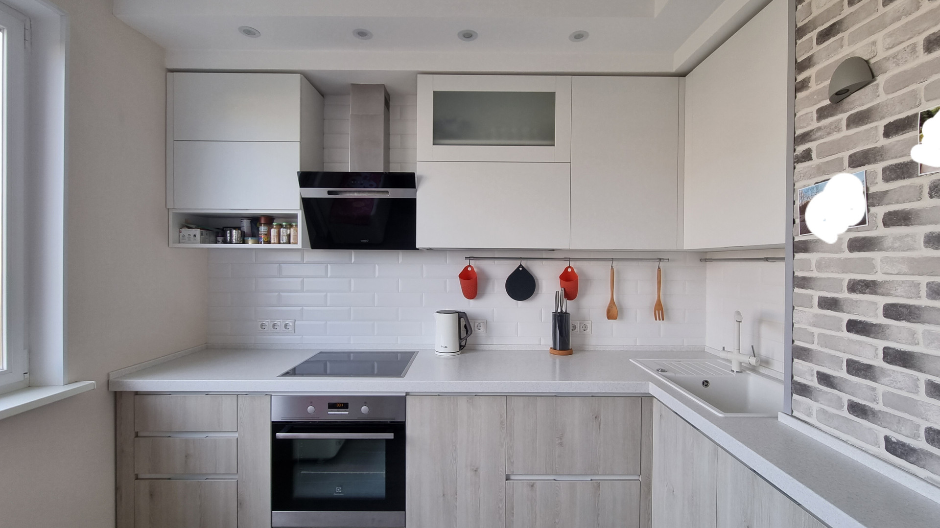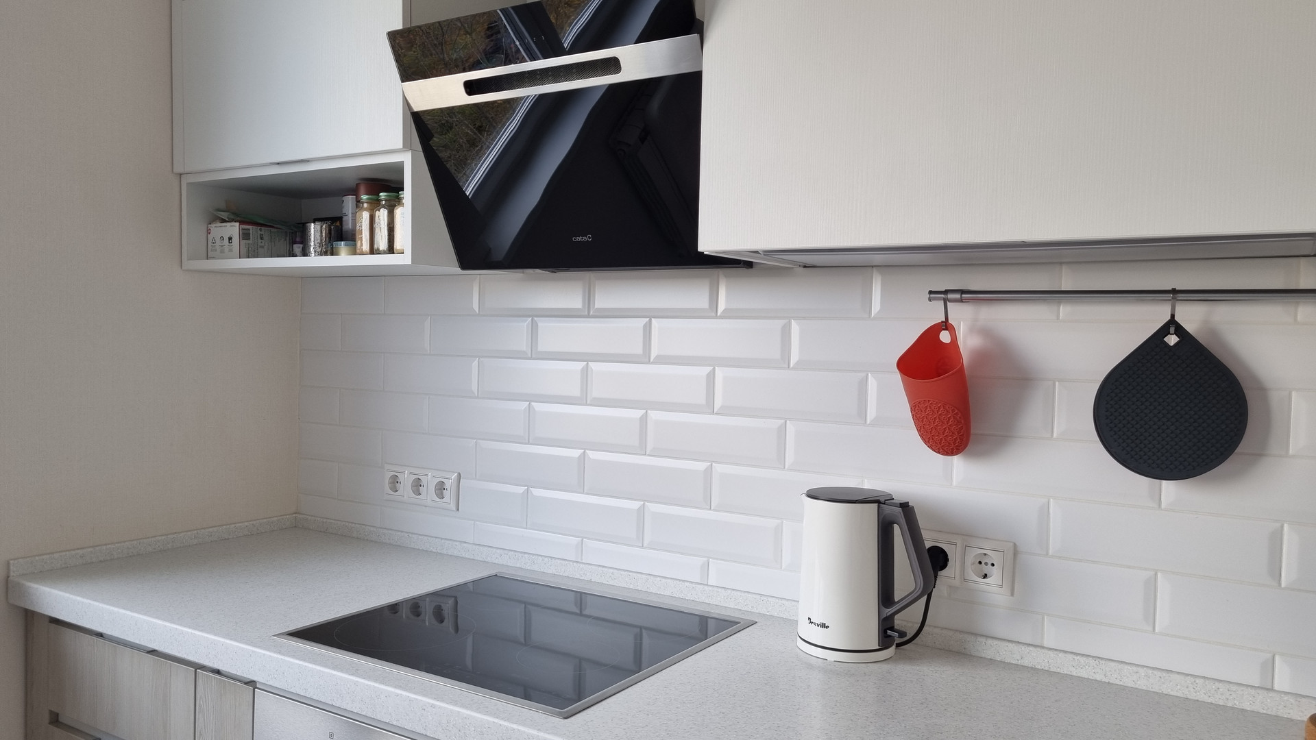 На кухне установлена дорогая и качественная техника: есть встроенная посудомоечная машина Siemens, индукционная плита Electrolux, духовка Electrolux с телескопической направляющей и функцией самоочистки (пиролиз), вытяжка Cata.