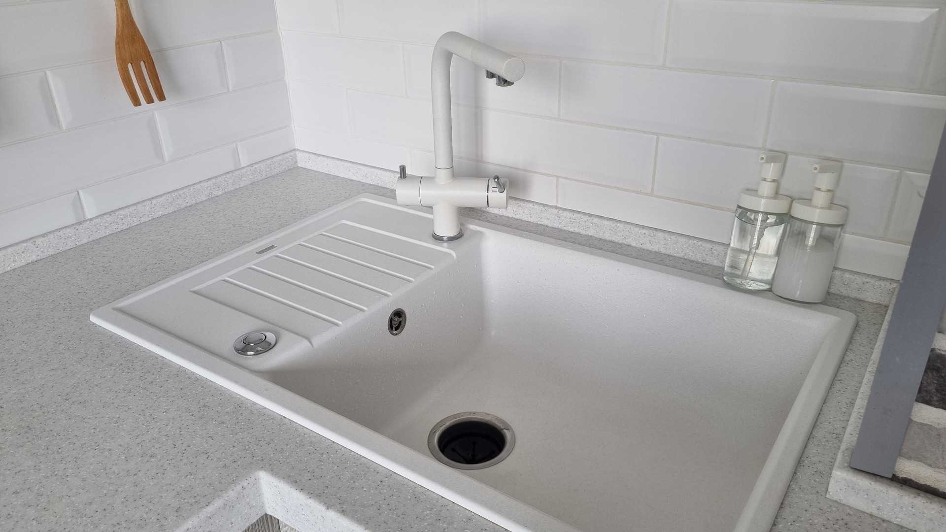 Дорогой лаконичный кухонный гарнитур (магазин "Стильные кухни") из износостойких материалов с доводчиками, качественной фурнитурой Blum. Столешница из камня, это долговечно и практично. Большая качественная раковина Blanco, встроен измельчитель для органических отходов. Имеется фильтр "Аквафор" с четырехступенчатой очисткой воды.