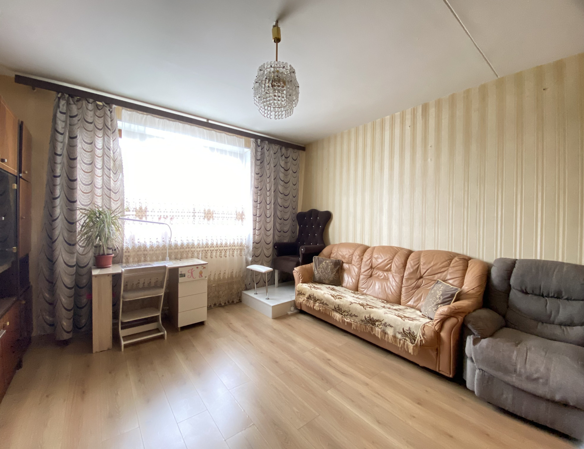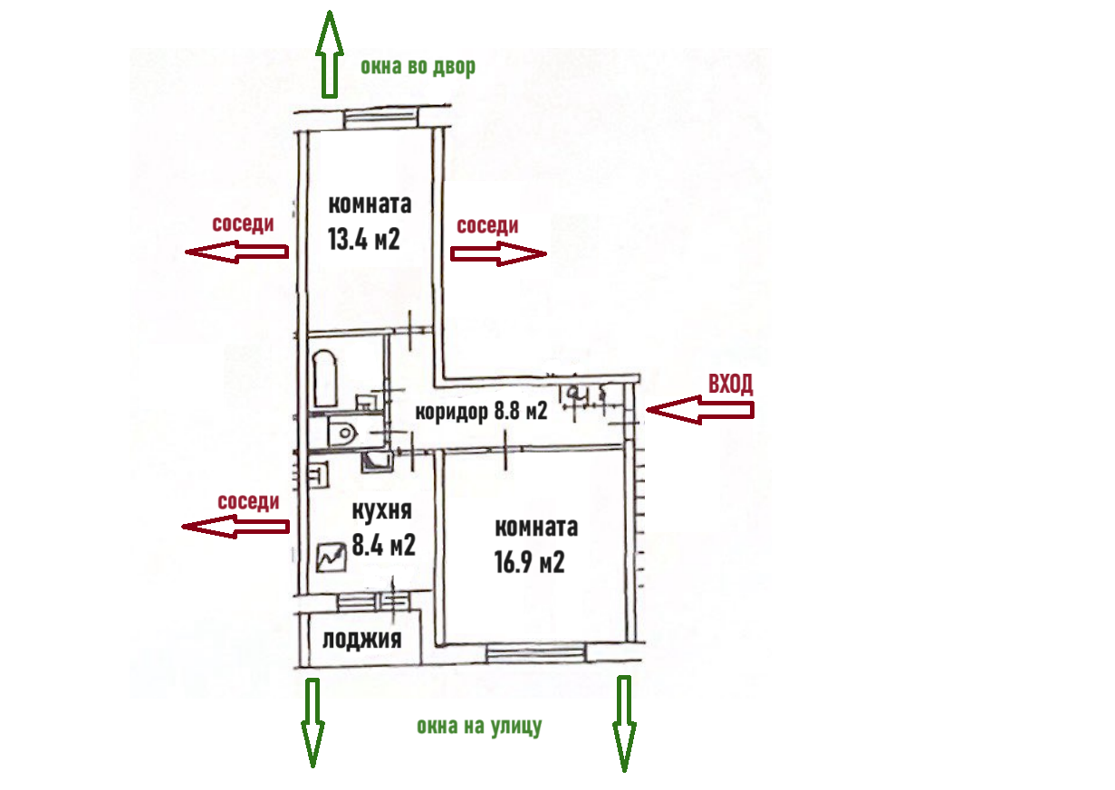 - распашонка, окна выходят на разные стороны (спальня - во двор, гостиная и кухня - на улицу)