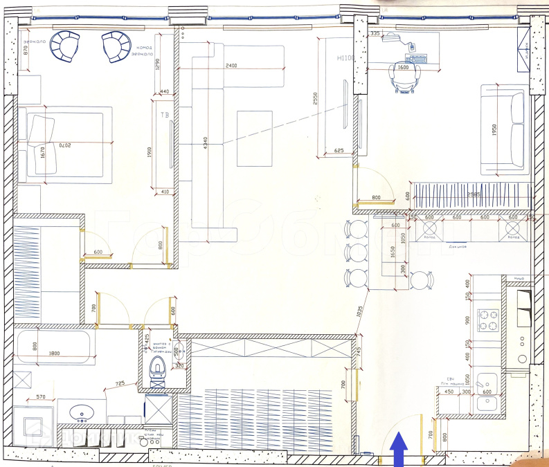 - Просторная кухня- гостиная, выделенная рабочая  зона; 2 изолированные комнаты; большая ванная комната; отдельный с/у; две очень вместительных гардеробных.
