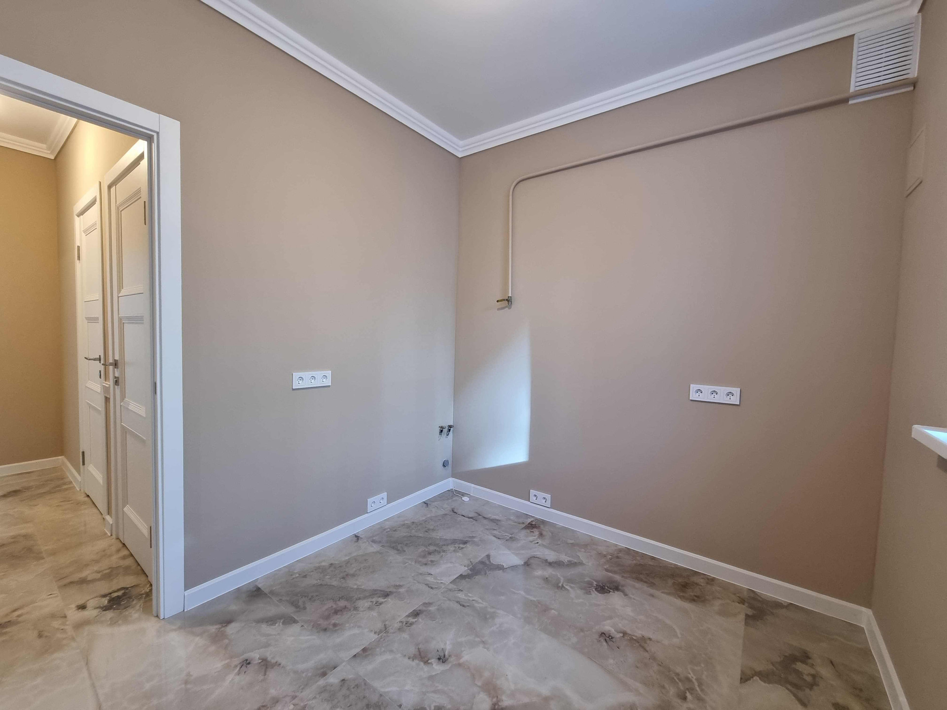 Все стены и потолки покрашены приятной глазу стойкой моющейся краской Dulux.