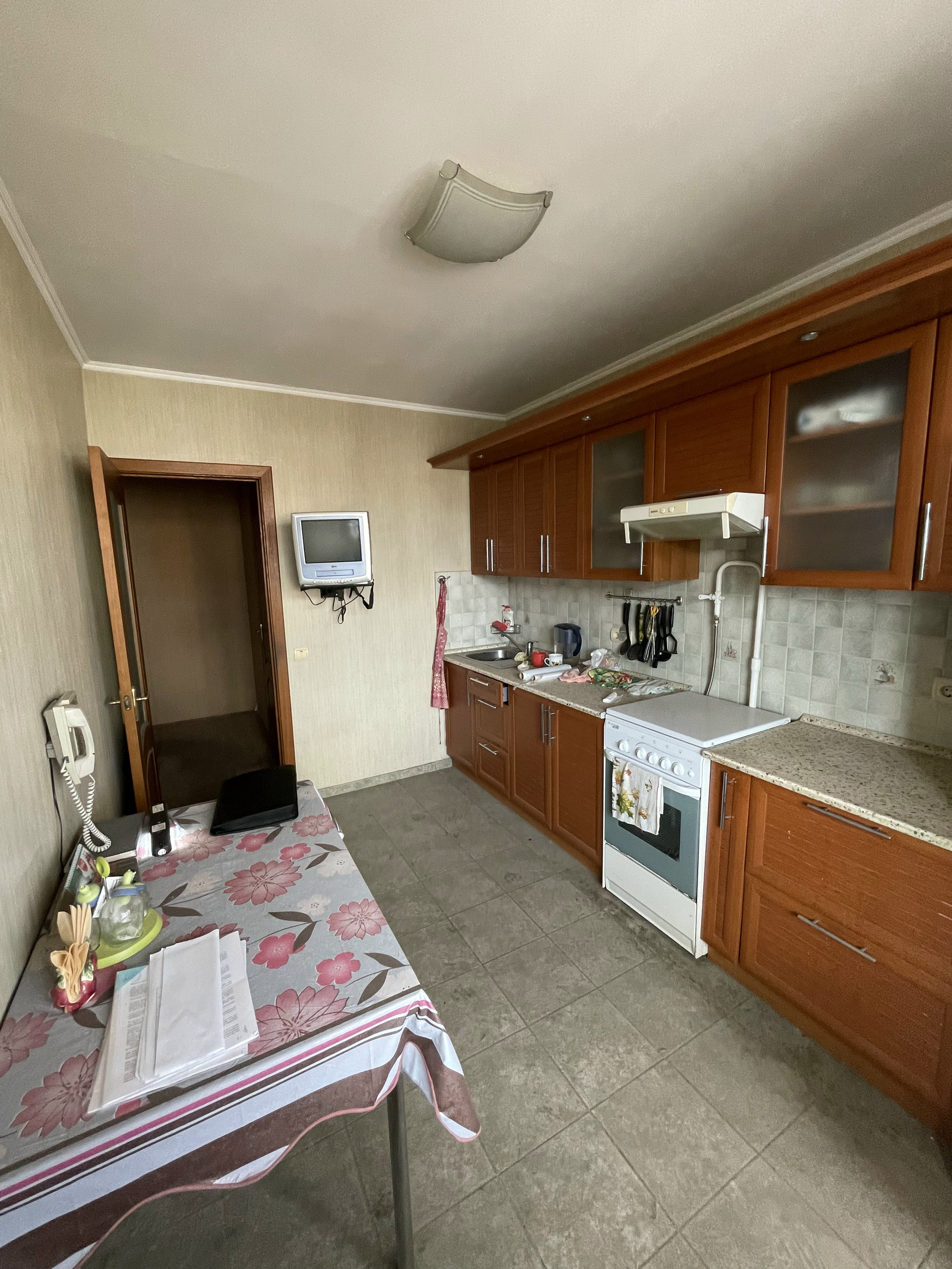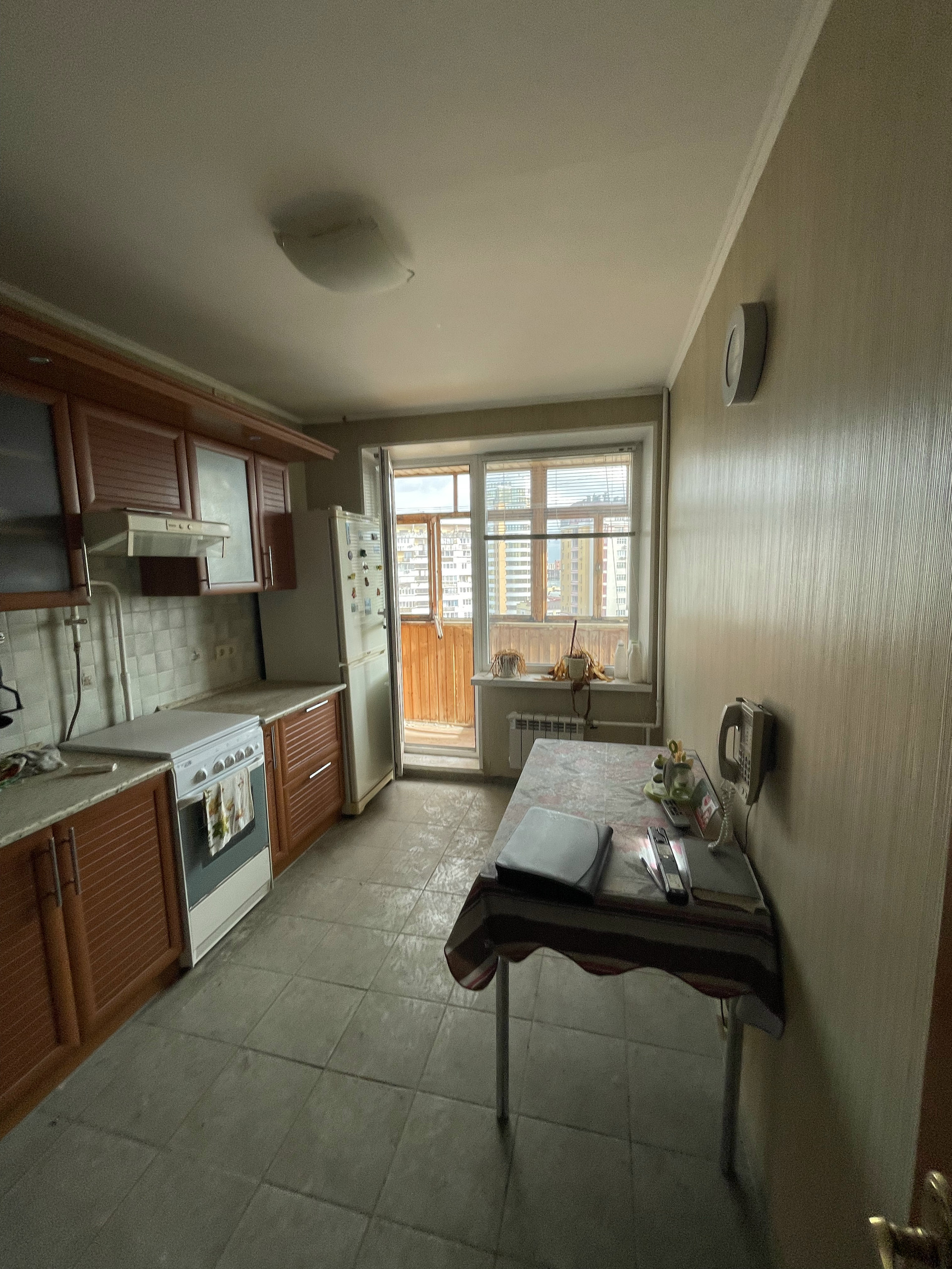 Площадь кухни 9,2 кв.м. Из кухни есть небольшой балкон, с прекрасным видом на Москву, так как этаж последний. Над этажом есть технический этаж, кровля не протекает, все потолки сухие. В доме газ, есть газовая плита, вытяжка, холодильник.