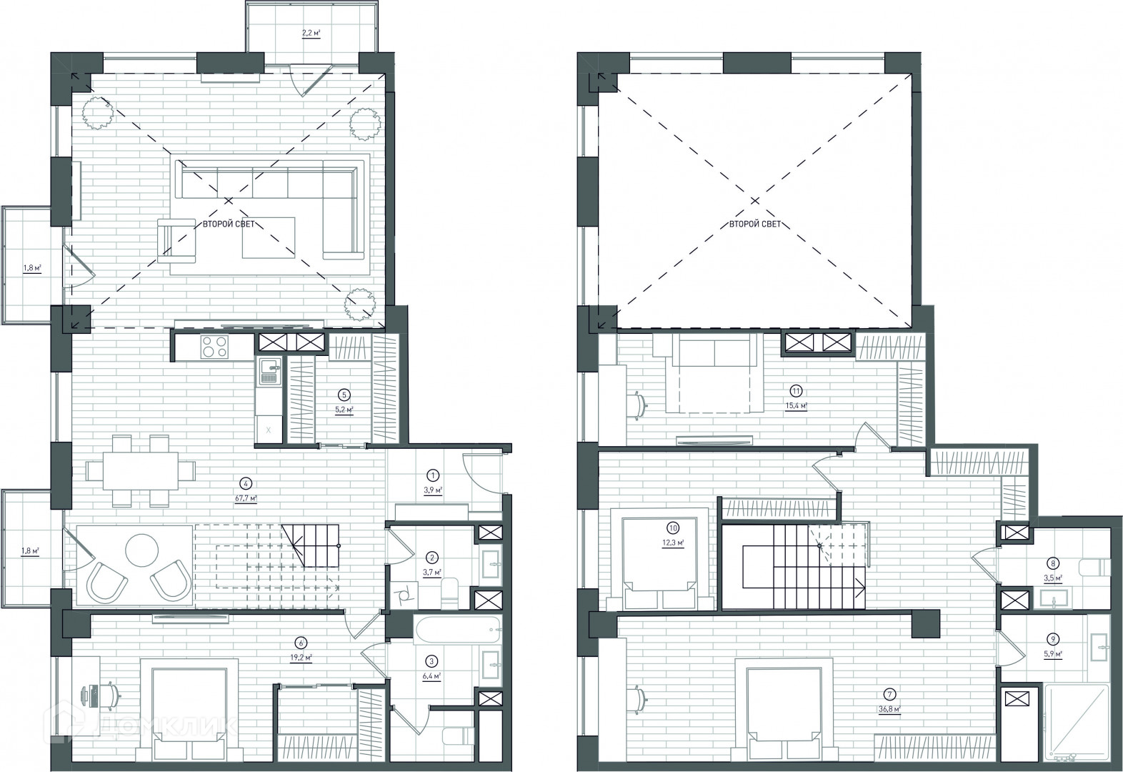 Двухэтажная резиденция с вторым светом, витражными окнами, открытым балконом и собственным выходом на крышу.