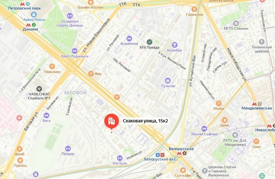 Всего в 10 минутах ходьбы м. Белорусская (зелённая ветка), Белорусский вокзал – 8 минут пешком, м. Динамо – 16-20 минут пешком (БКЛ Петровский парк).