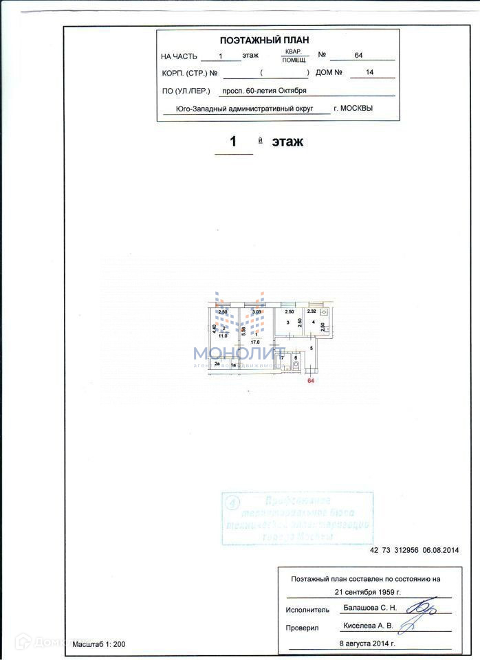 3-комнатная квартира, 53 м2, этаж 1 / 5, на продажу в Москве, проспект 60-летия Октября, 14