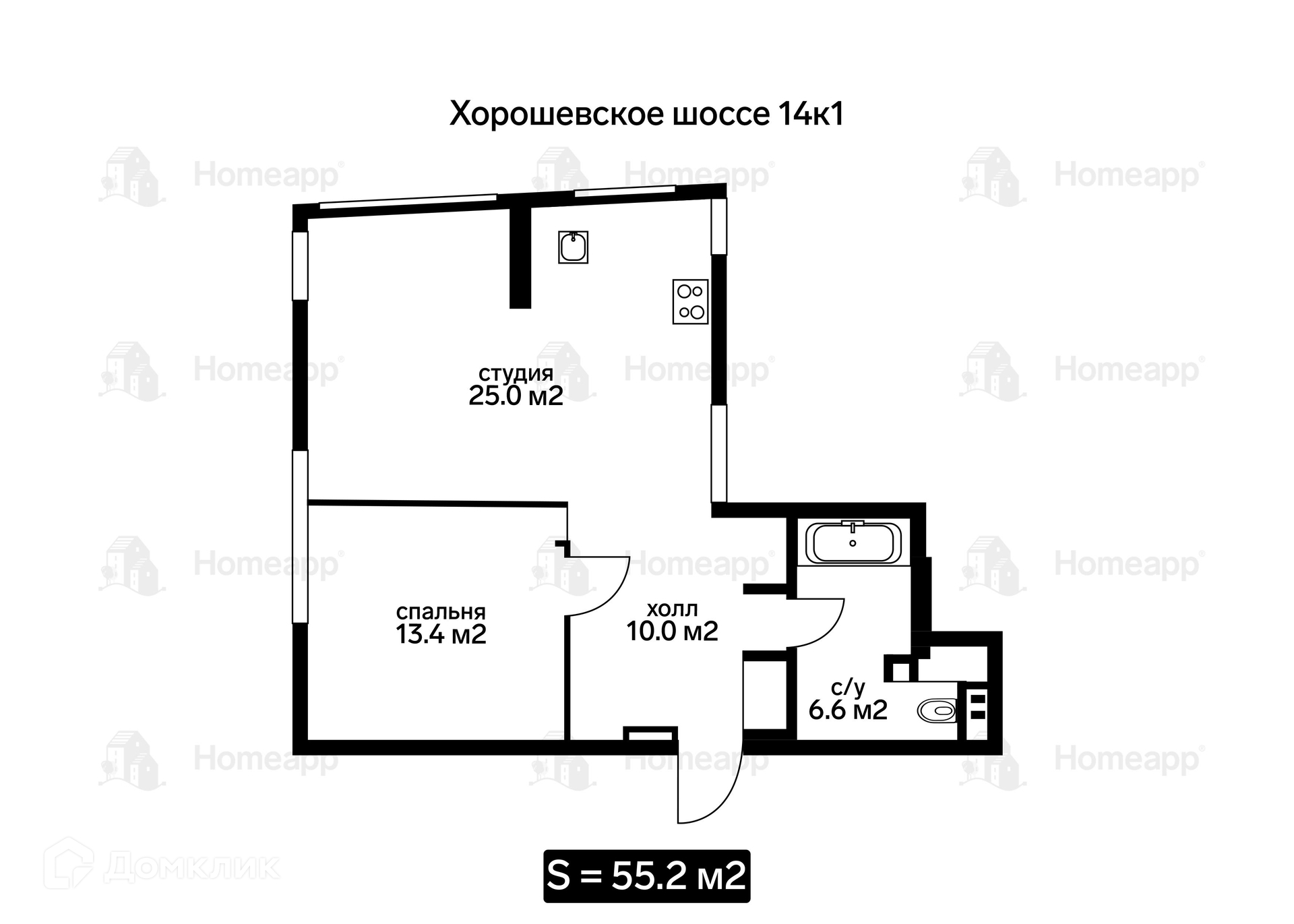 Общая площадь 55.2 м2