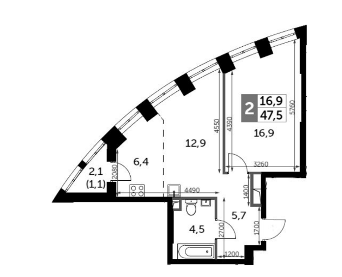 Общая площадь 47.5 м2