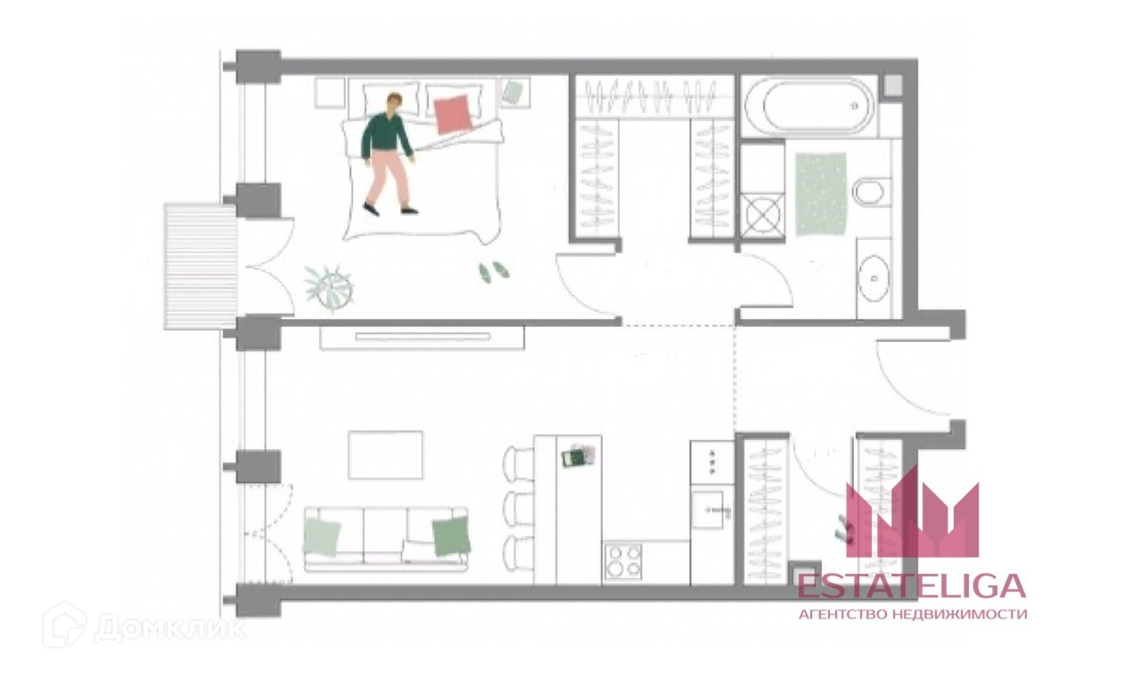 Возможная планировка: кухня-гостиная, спальня с гардеробной и санузлом, гардеробная, постирочная, прихожая.