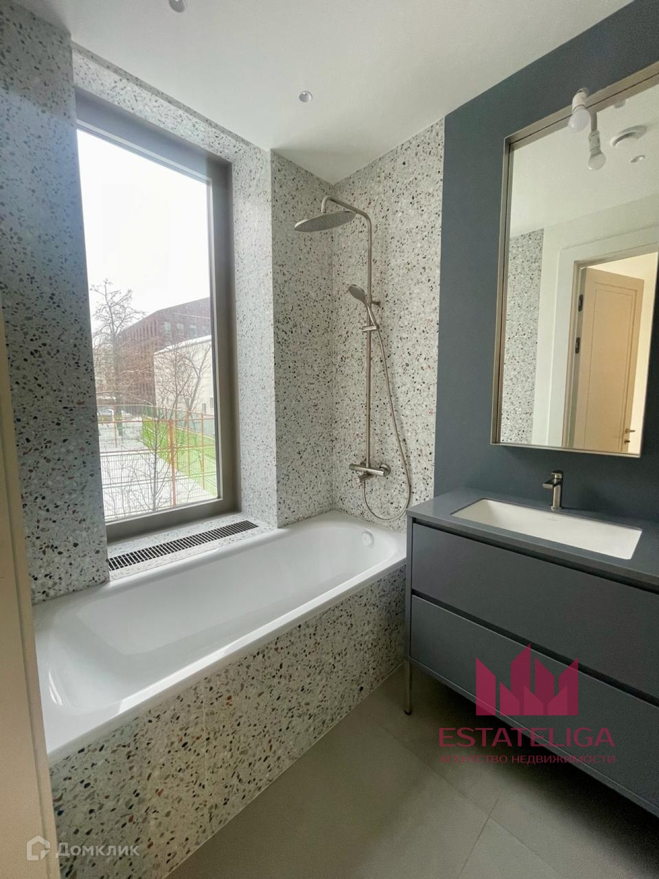 Санузлы облицованы керамогранитом и бетонной плиткой Терраццо. Сантехника марки Villeroy&Boch.