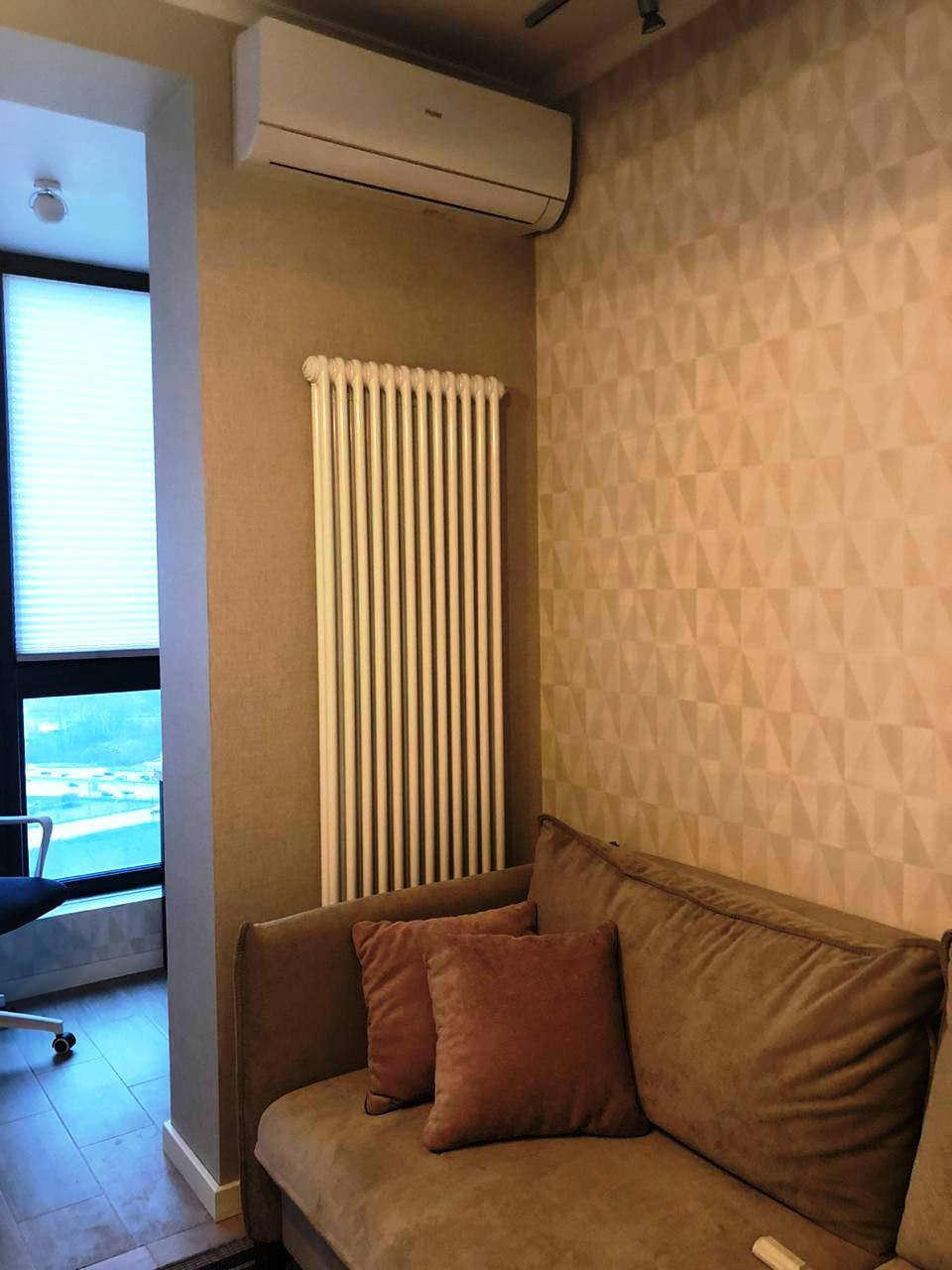 Итальянские радиаторы, заменены стеклопакеты - панорамные окна с ШИКАРНЫМ ВИДОМ, теплый пол в зонах плитки (кабинет, кухня, санузел), много различных подсветок, итальянские обои, керамогранит, качественная мебель и сантехника.