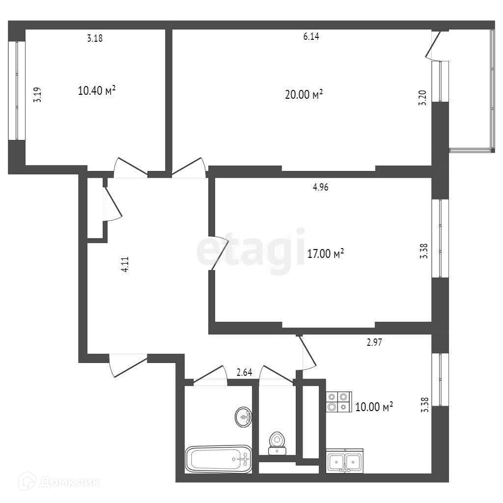 Квартира состоит из 3 изолированных комнат - 10,4кв.м, 20кв.м, 17кв.м, кухни - 10кв.м, прихожей 4,1кв.м, раздельного санузла. В одной из комнат имеется выход на застекленную лоджию. Дом построен и сдан в 2016 году.