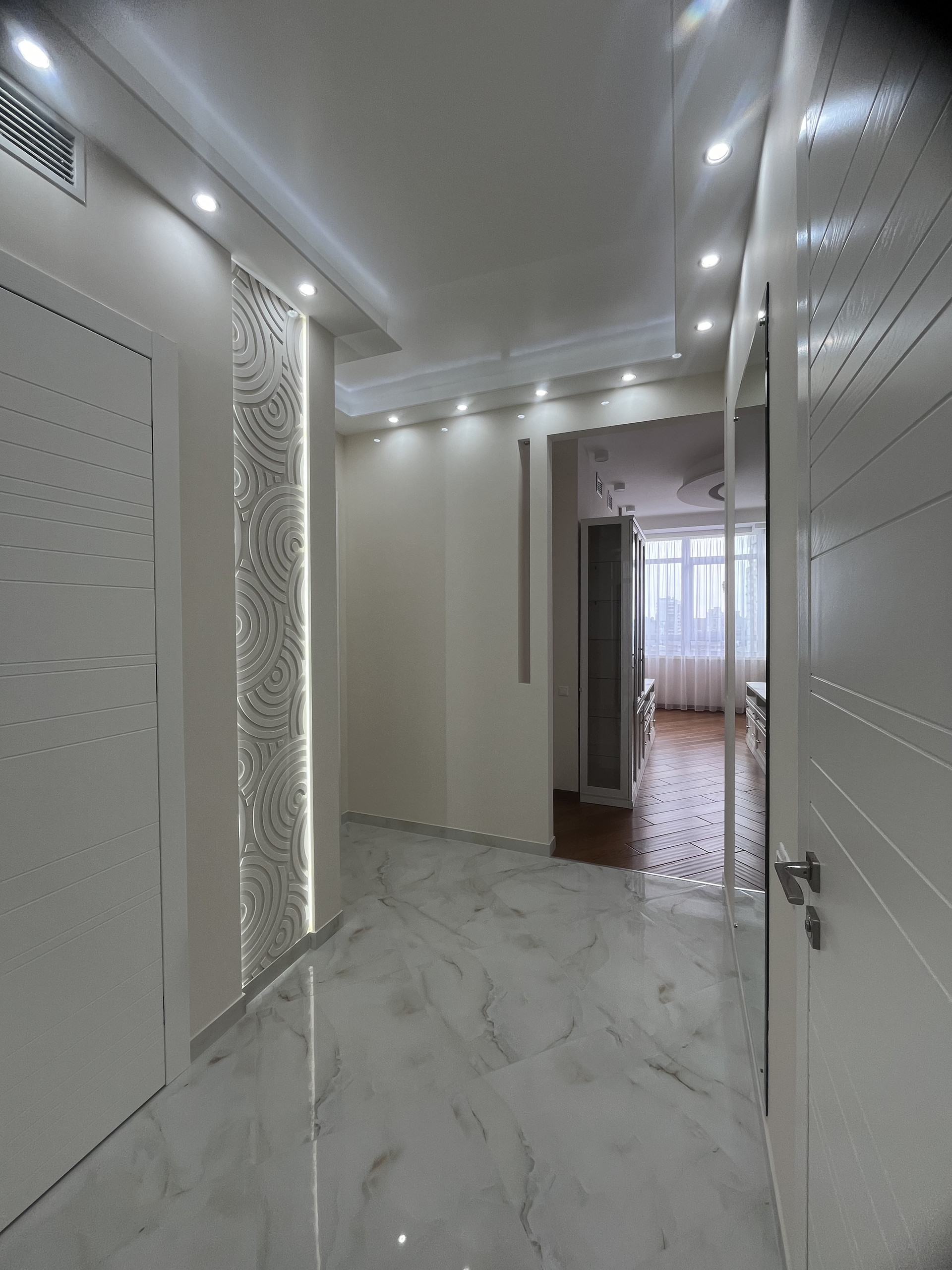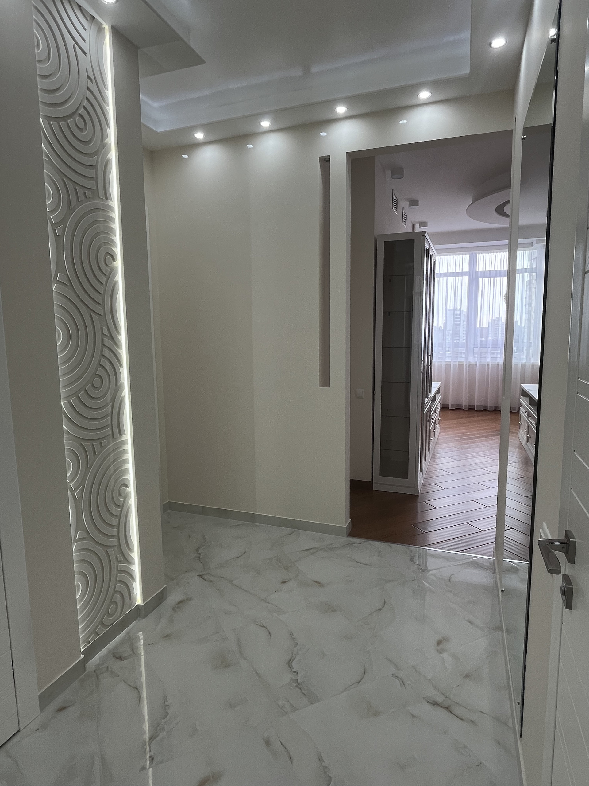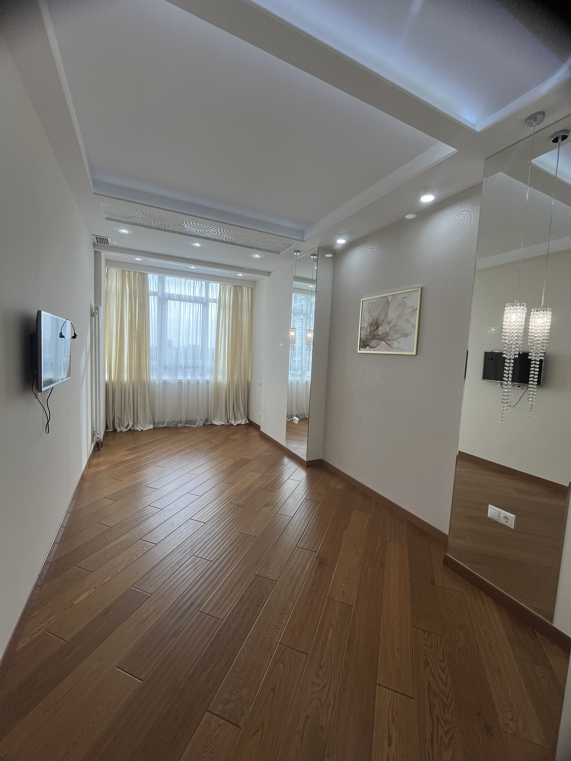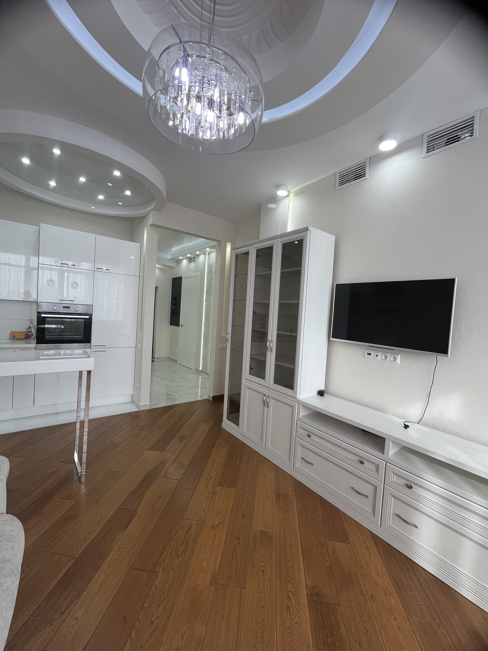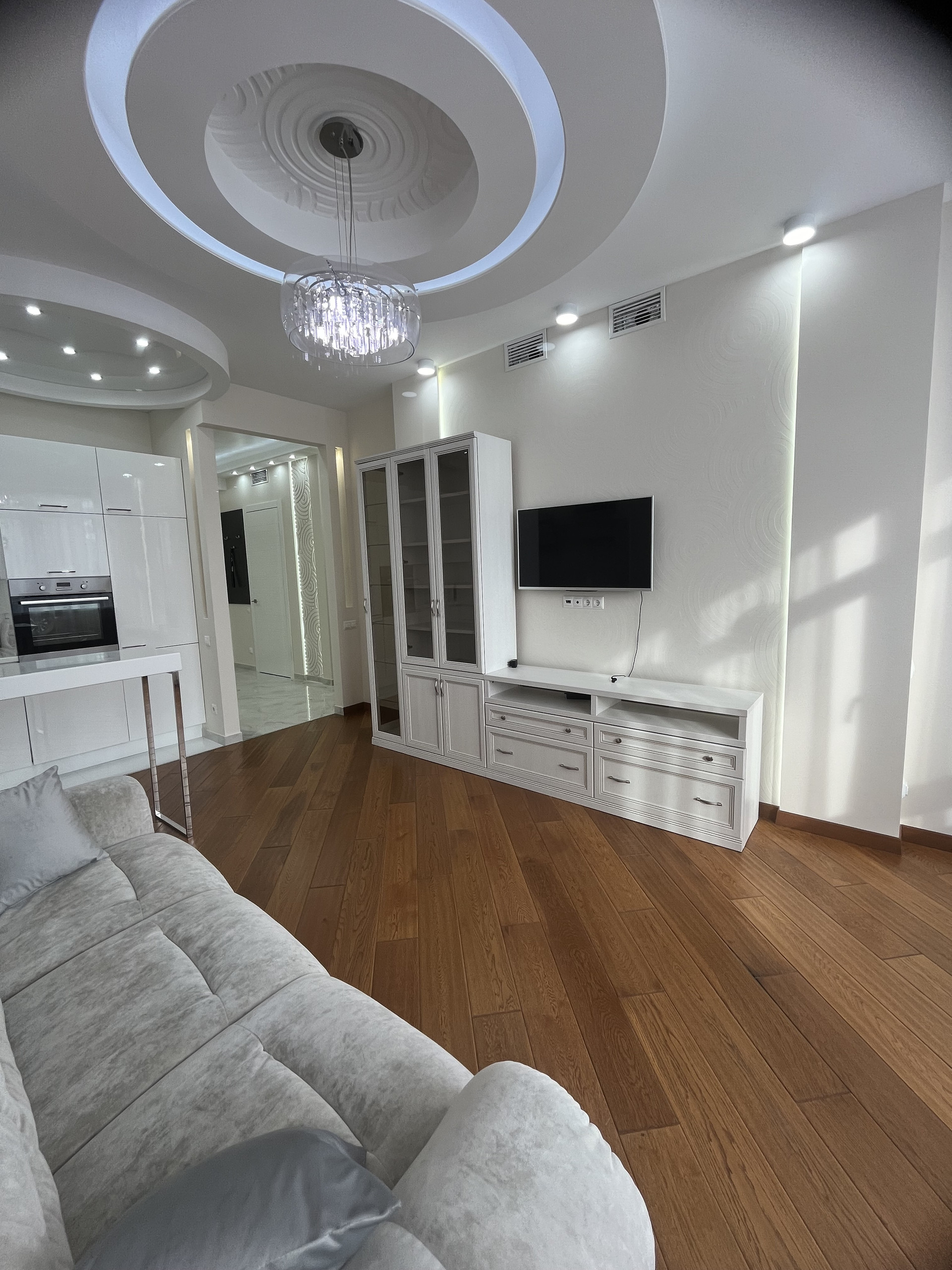 В отделке квартиры использовались высококачественный, дорогие материалы: в прихожей и в санузле мраморный пол с подогревом, в комнате и гостиной - паркет, деревянные массивные двери, встроенная мебель и техника, диван и кресло с ортопедическим матрасом. Окна - двойные стеклопакеты, с широкими мраморными подоконниками, вместительная, функциональная гардеробная. Отличная планировка: большая кухня-гостиная 20 кв.м., спальня 18 кв.м. вместительная гардеробная выходит из коридора. Квартира укомплектована всем необходимым и полностью готова для проживания.