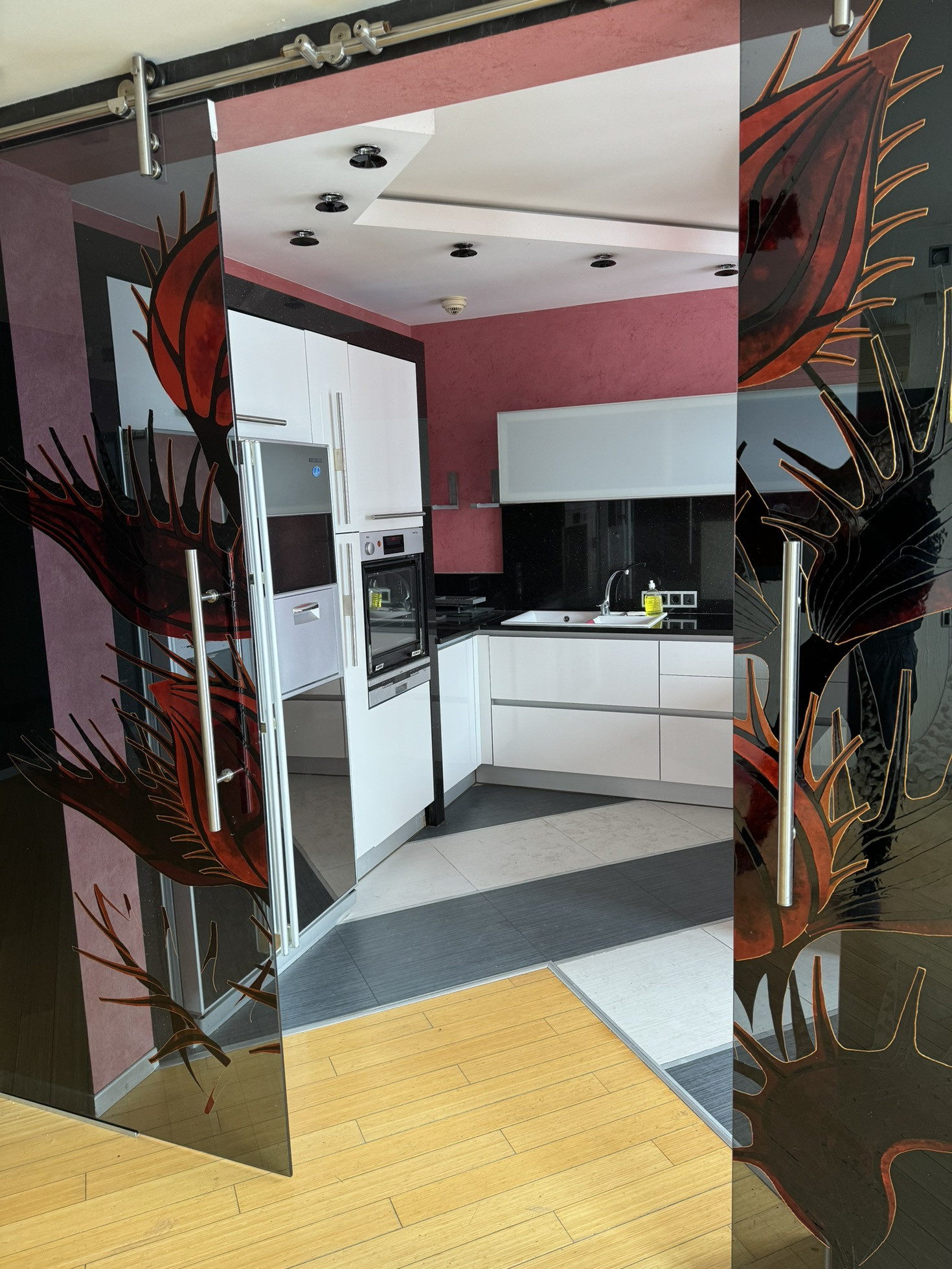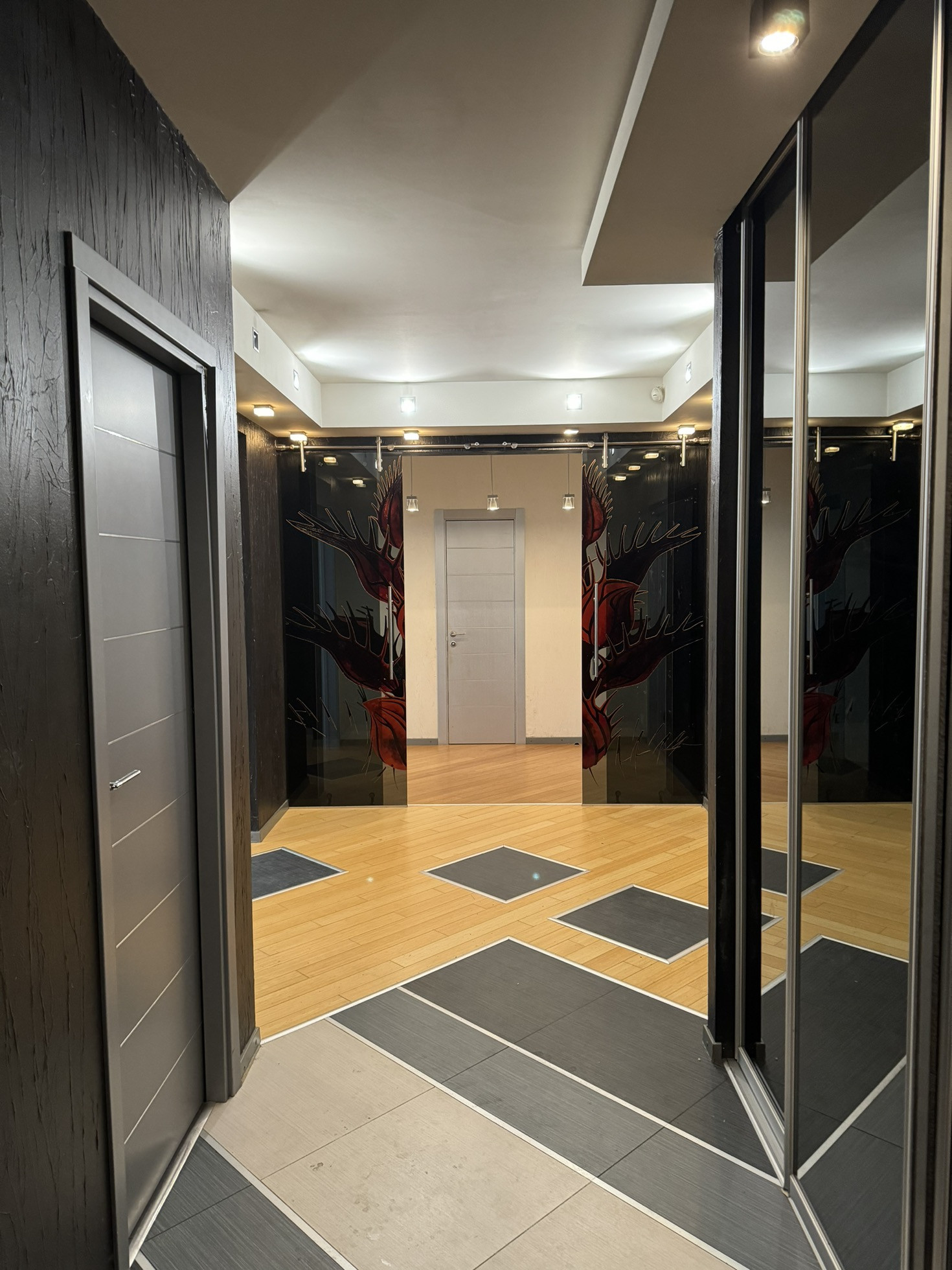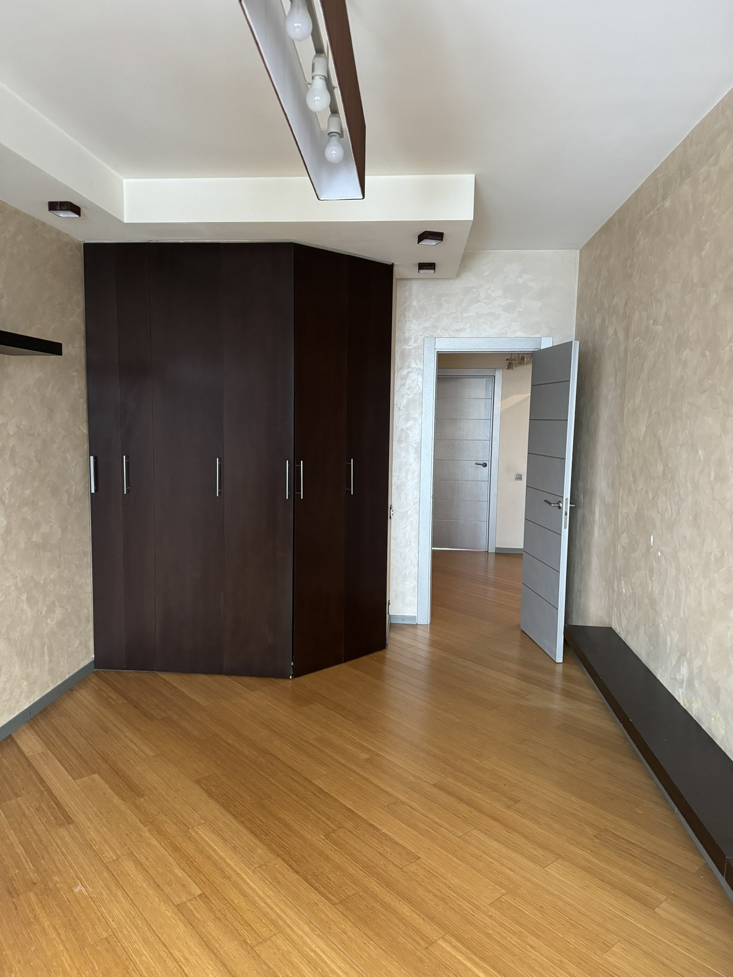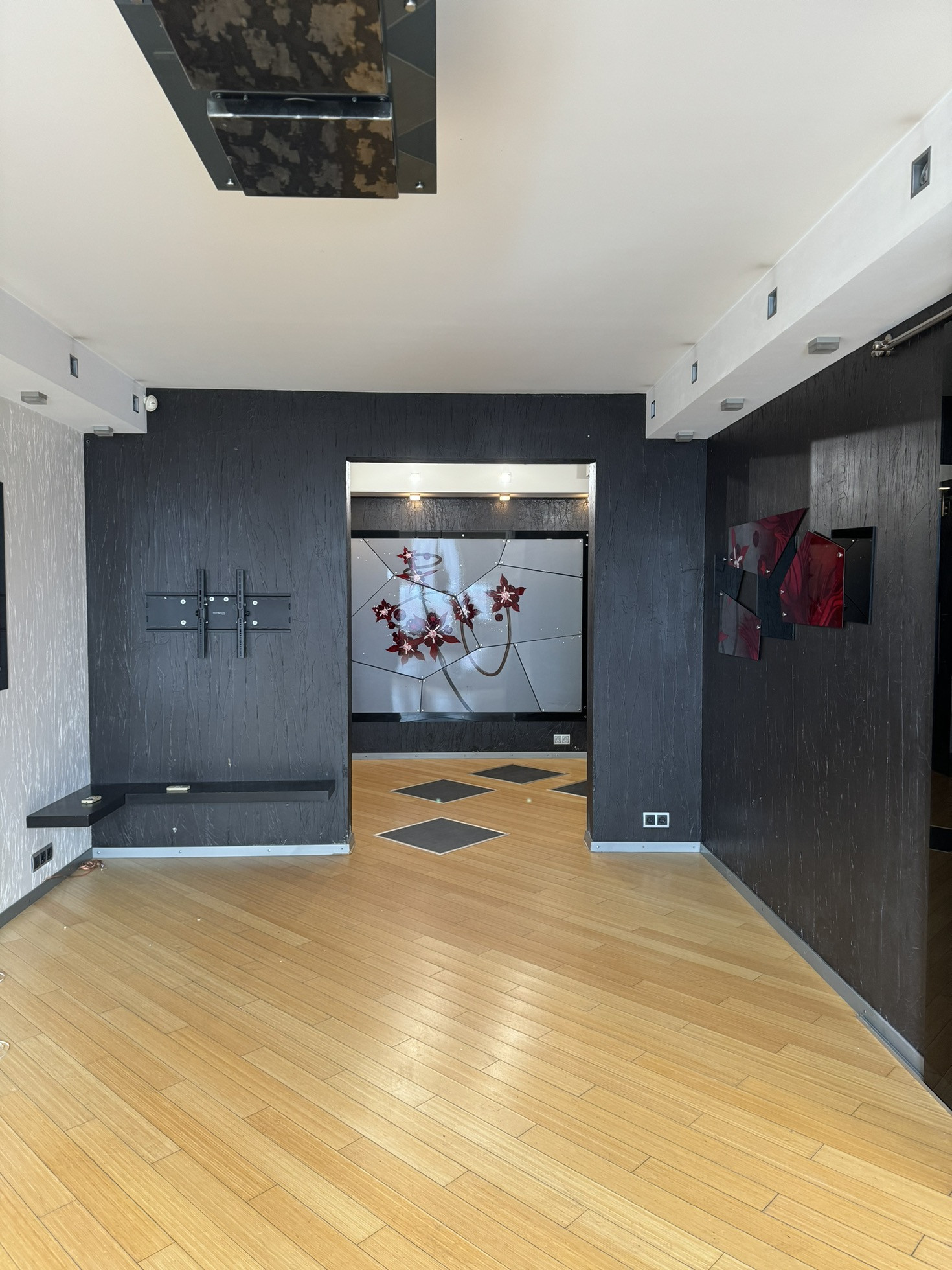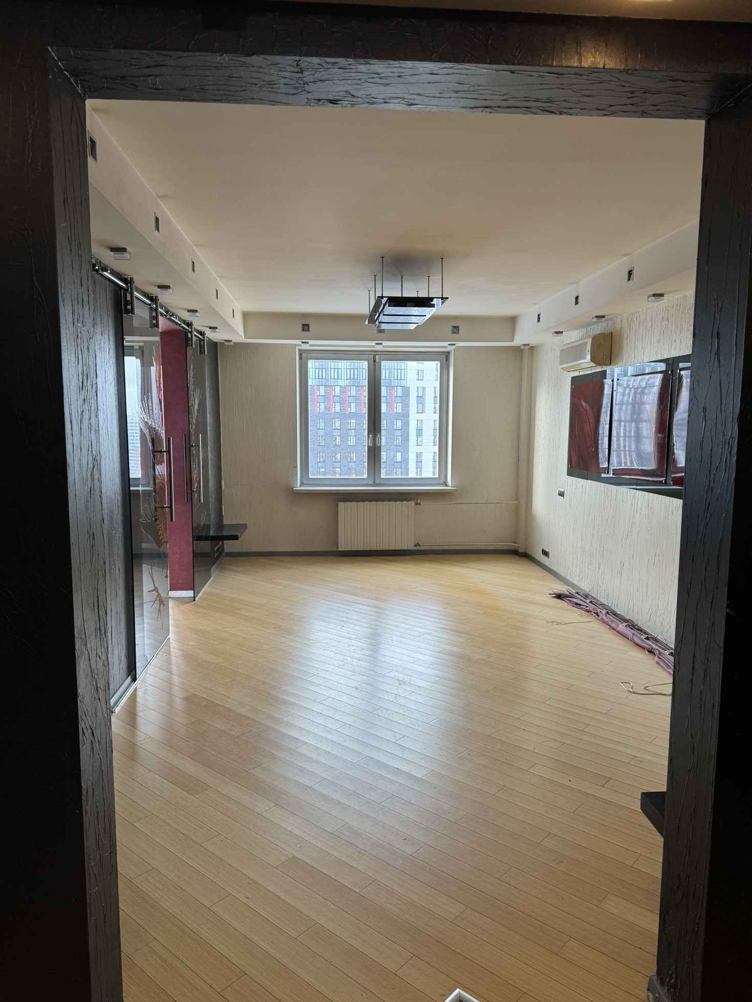Большая гостиная комната, отделенная от кухни дизайнерскими раздвижными дверьми, две спальные комнаты (одна с лоджией, в которой оборудован кабинет, вторая с гардеробом). Комнаты оборудованы кондиционерами. Квартира оборудована иностранной бытовой техникой.