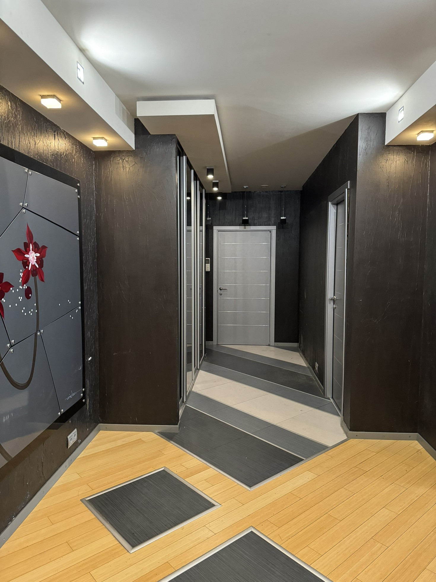 Два совмещённых санузла (один с ванной, второй с душевой кабиной). Полы в гостиной и в спальных комнатах выложены паркетной доской. Полы входной зоны, в санузлах и на кухне выложены плиткой. Теплые полы во входной зоне, в зоне кухни и в санузлах.