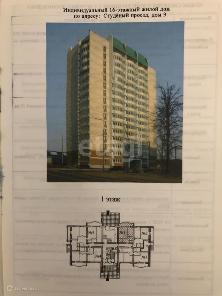 1-комнатная квартира, 38 м2, этаж 1 / 16, на продажу в Москве, Студёный проезд, 9