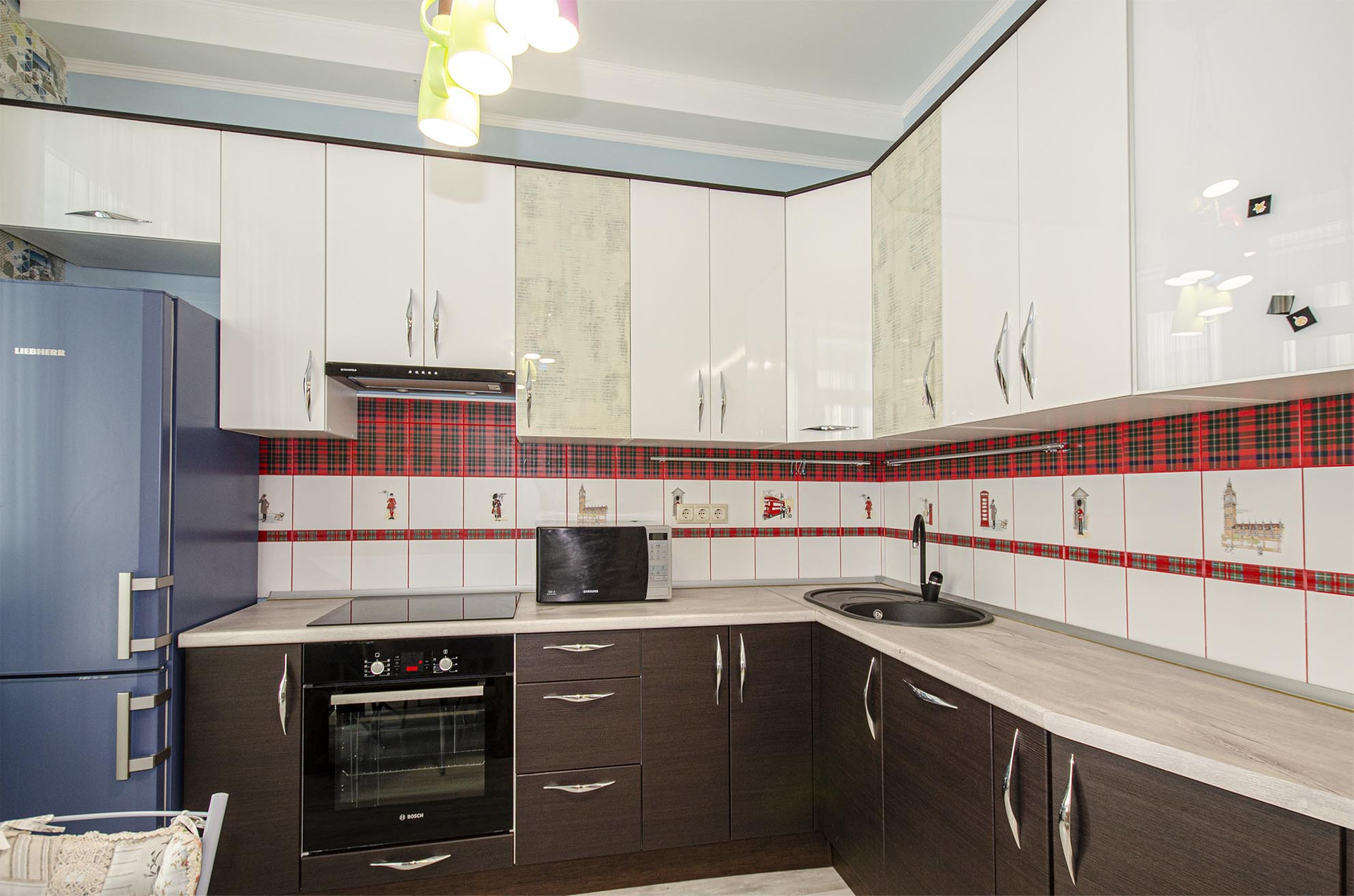 - Встроенная кухня с бытовой техникой (варочная панель, духовой шкаф, холодильник, посудомоечная машина)