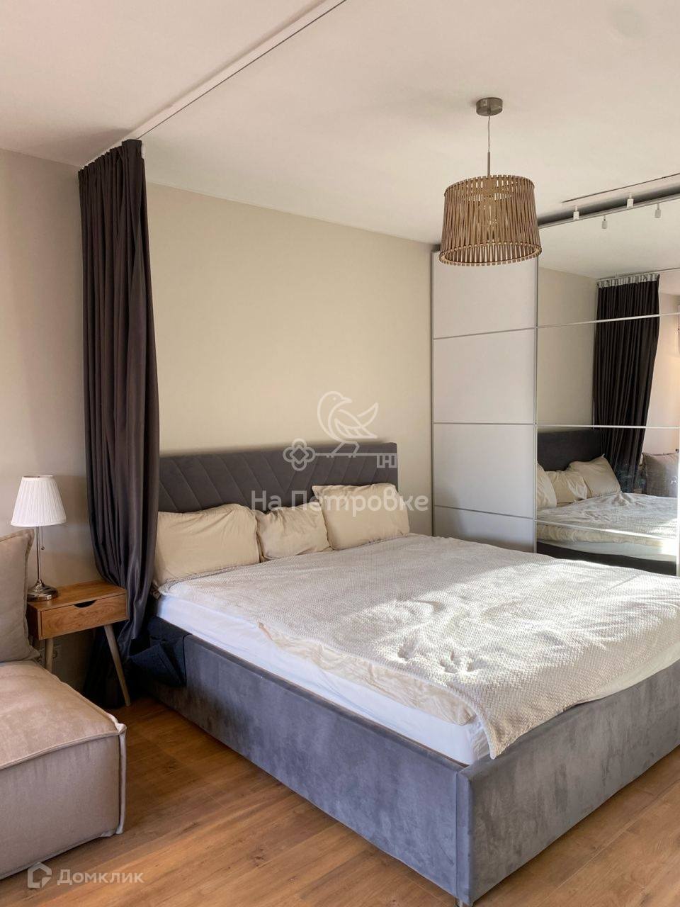 В зоне спальни большой вместительный шкаф с зеркальными фасадами, что визуально увеличивает пространство.