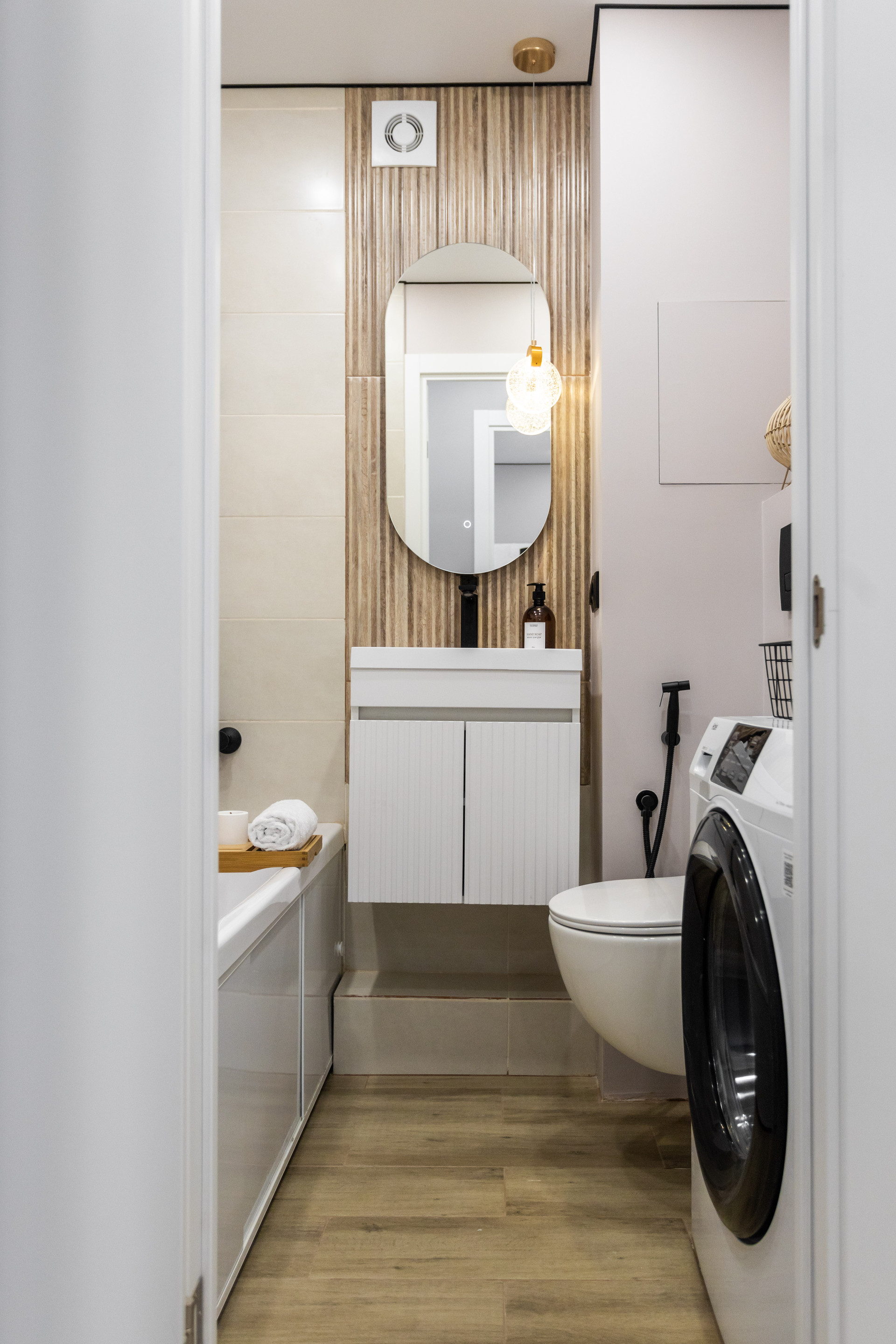 В СУ теплый пол, стиральная машина.
