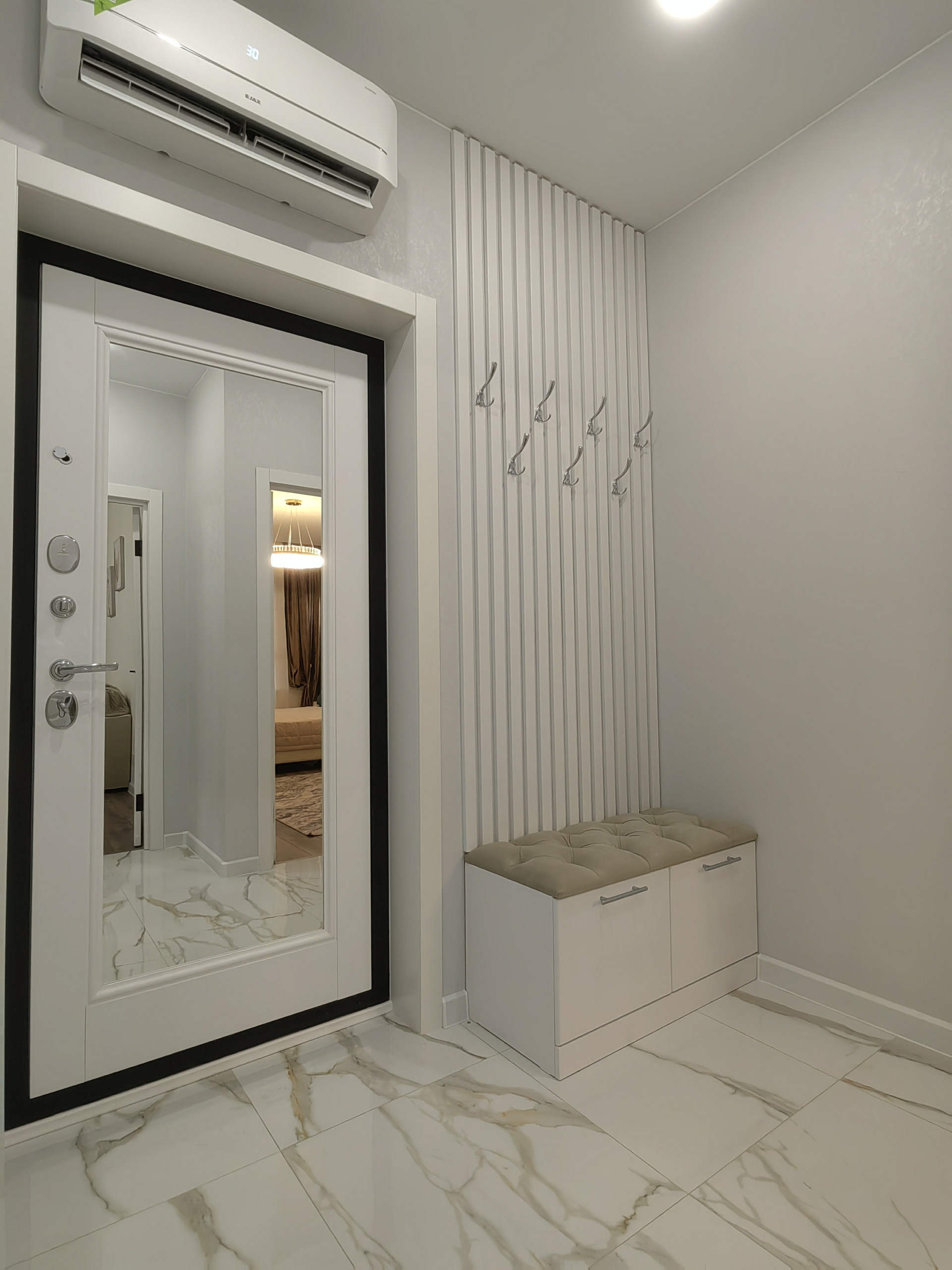 Установлен кондиционер, разноуровневое освещение, совмещенный просторный санузел с стиральной машиной, Есть вся бытовая техника ( плита, духовка, холодильник, стиральная и посудомоечные машины, и необходимая для жизни мебель,  большая гардеробная. Больше ничего покупать не надо, можно сразу заезжать.
