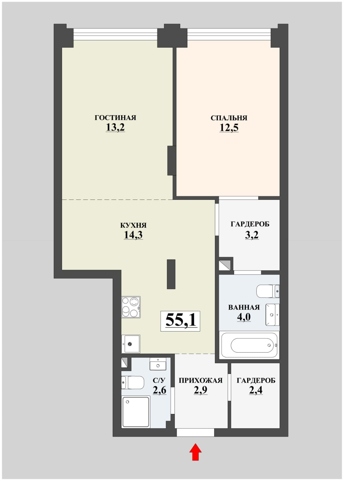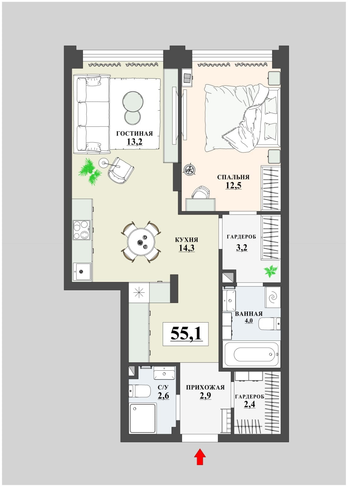 Общая площадь 55.1 м2