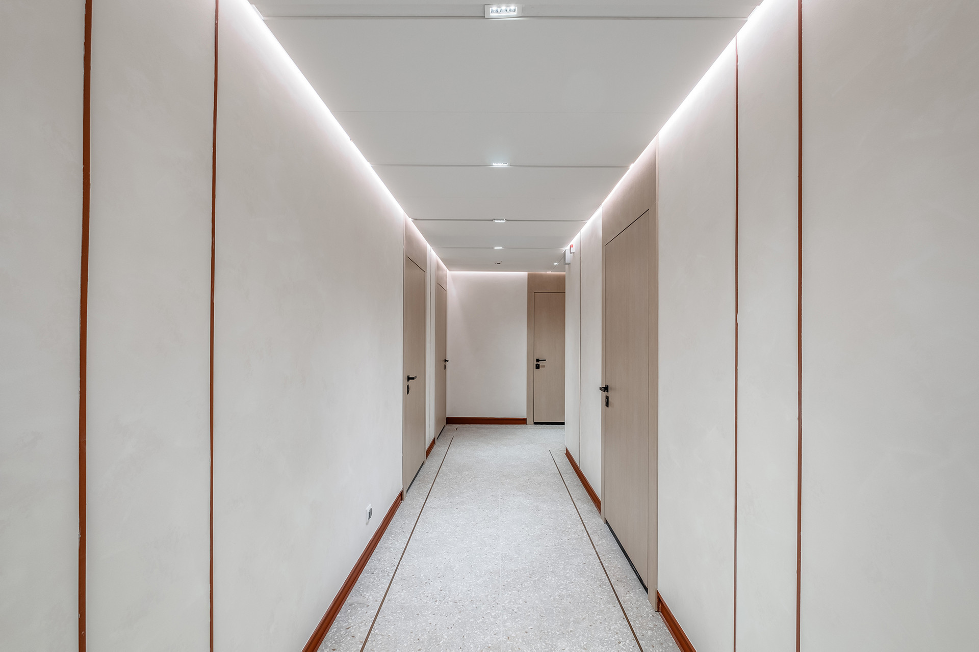 Фасады проекта оформлены клинкерным кирпичом ручной формовки терракотового, кофейного и серого цветов, а в сумерках фактурность кирпича подчеркивает подсветка.