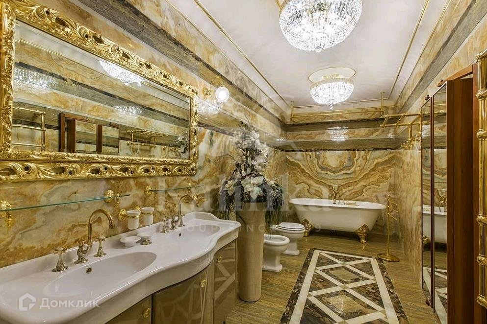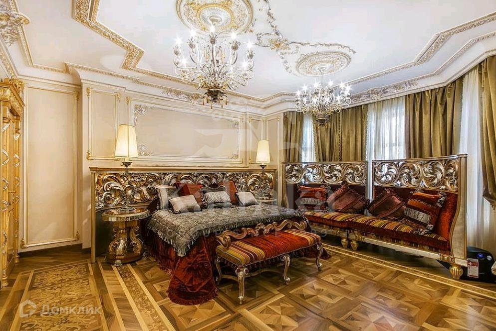 В отделке использованы дорогие высококачественные материалы: мрамор, дерево, хрусталь, шелк, золото.