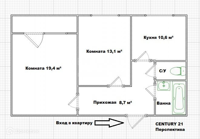 Жилая площадь 45.6 м2
