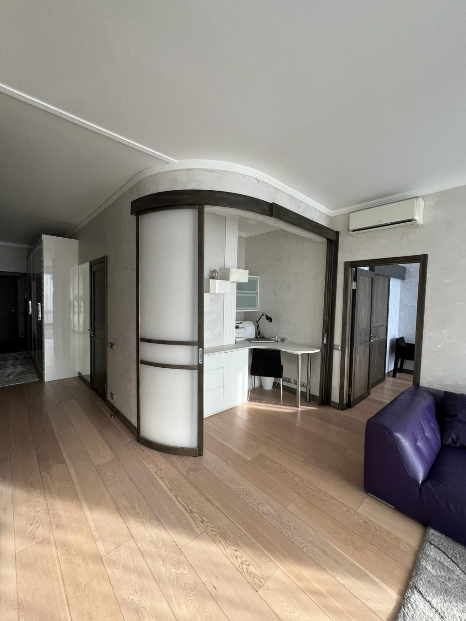 Планировка квартиры очень функциональна: кухня-столовая, кабинет, гостиная, спальня с гардеробной комнатой, просторная ванная комната (спа-кабина с сауной).