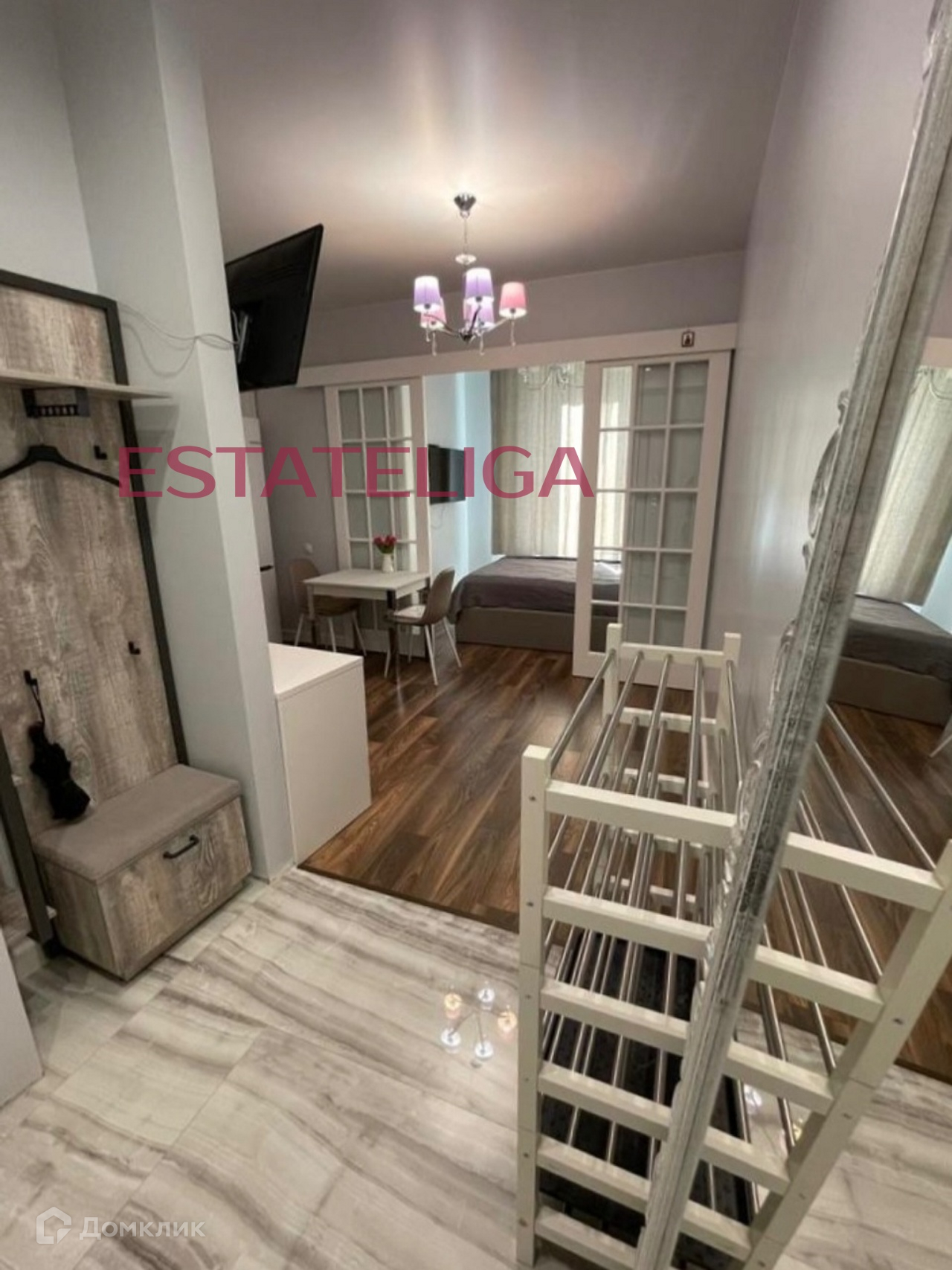 Функциональное и уютное зонирование студии, разработанное по индивидуальному дизайн-проекту: изолированная спальная зона с гардеробной комнатой внутри, кухня-гостиная, совмещенный санузел с душевой кабиной, холл.