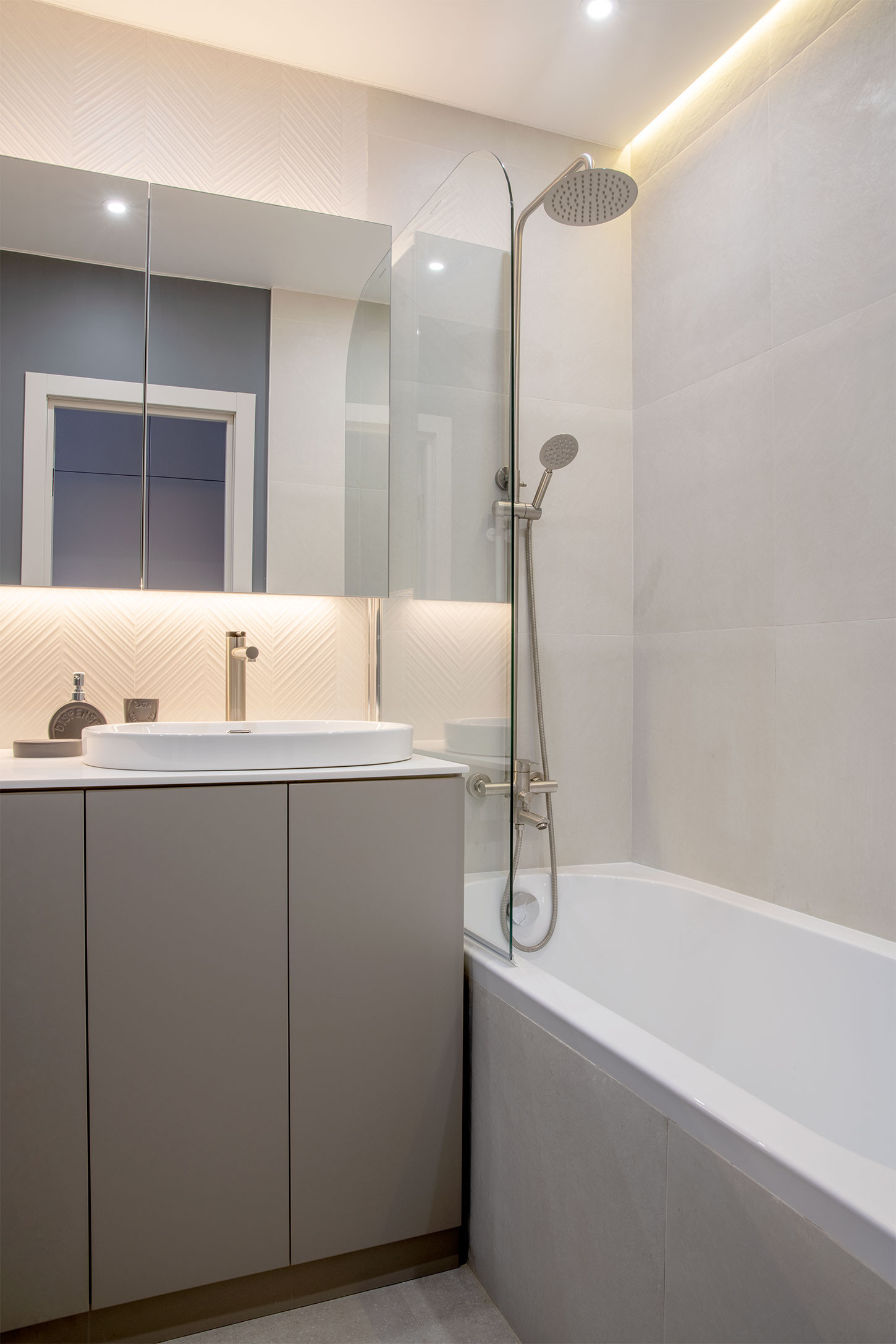 В санузле предусмотрены вытяжка, гигиенический душ, стеклянное ограждение ванны, столешница из акрилового камня Grandex. В тумбе размещена новая стиральная машинка Weissgauff, над тумбой вместительный зеркальный шкафчик для хранения.