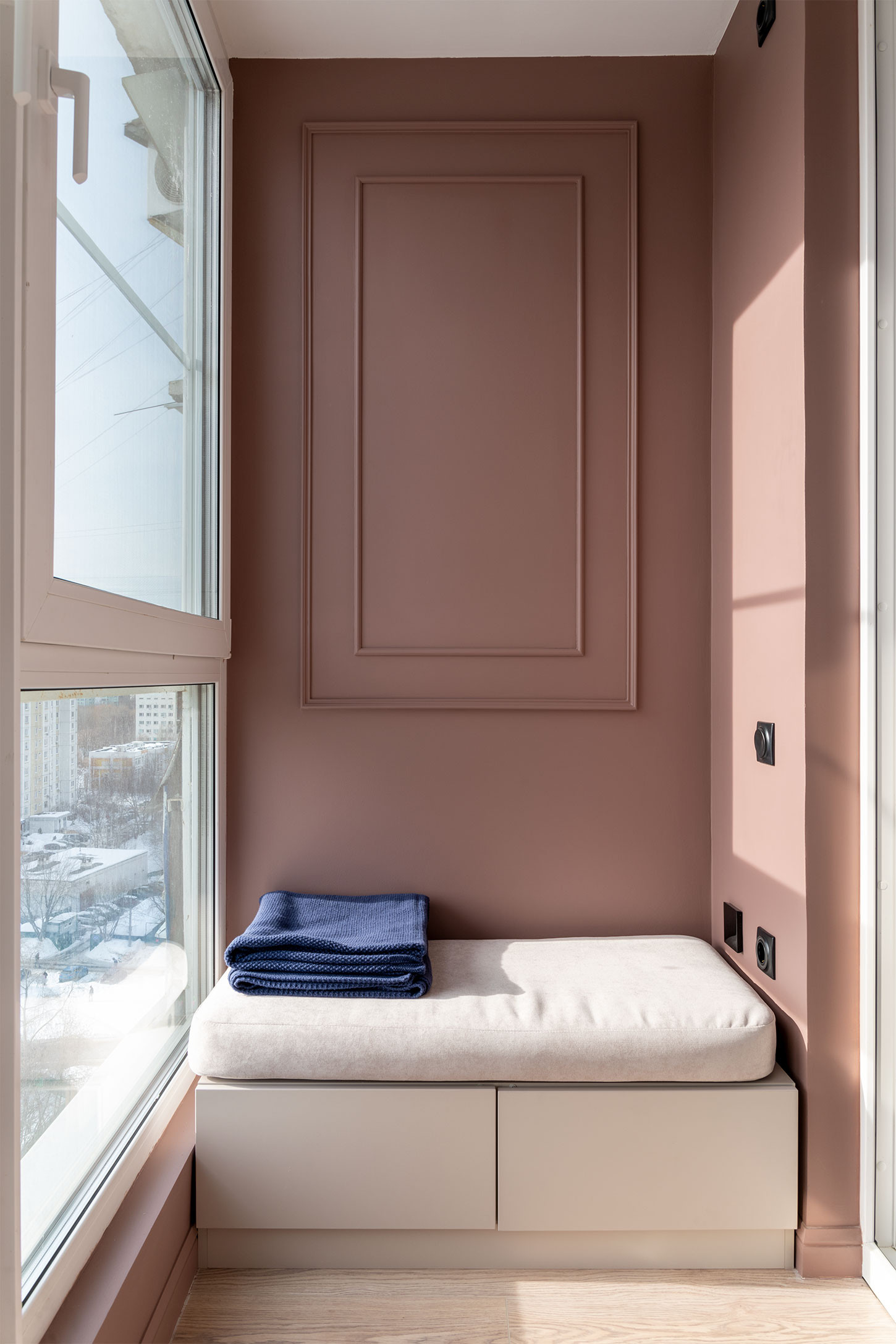 При спальне расположен балкон с рабочим местом и зоной для отдыха. Балкон оснащён тёплым полом и двухкамерными стеклопакетами, предназначен для круглогодичного использования. С балкона открывается панорамный вид который не будет закрыт новостройками.