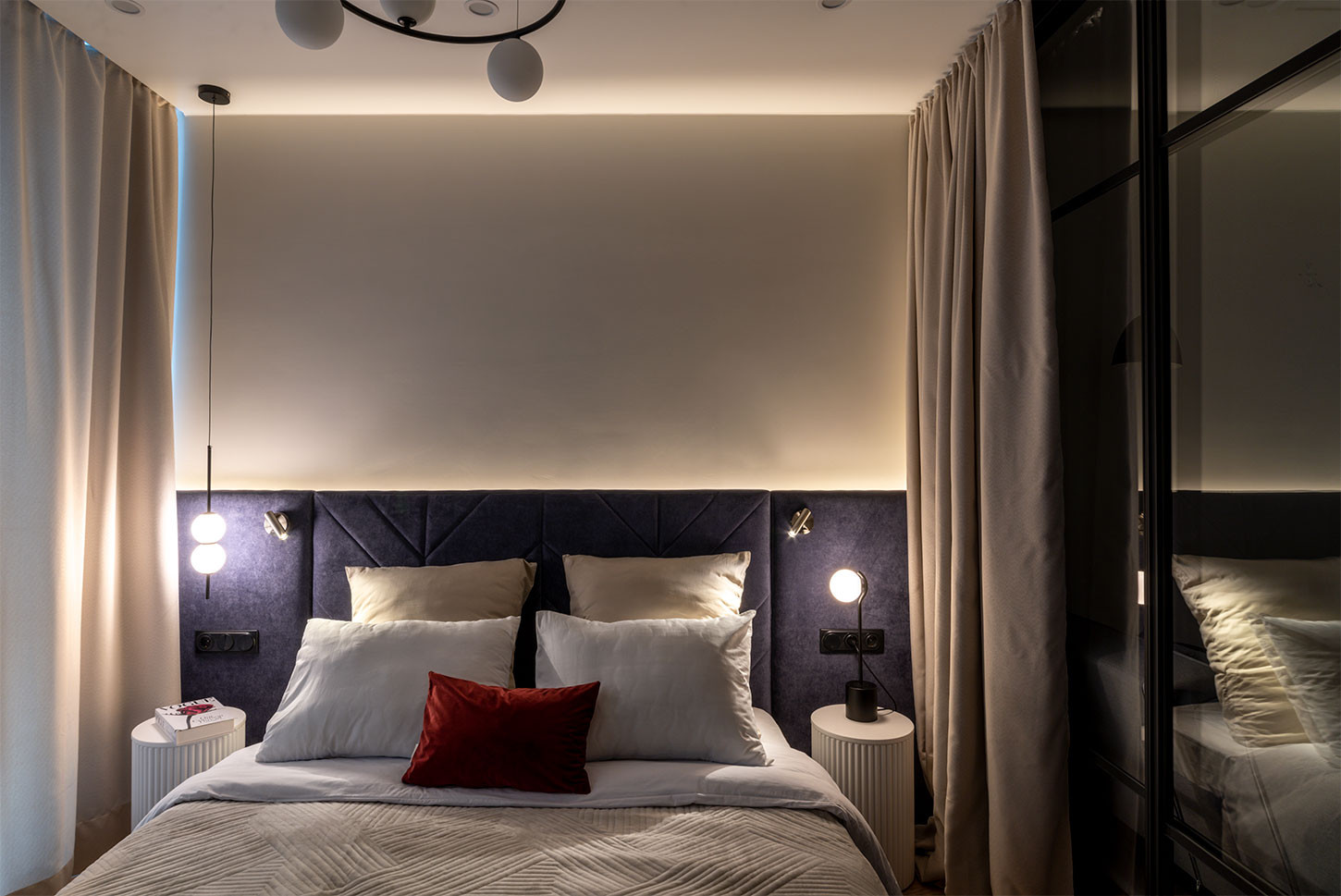 В большой комнате установлен кондиционер. Большая комната зонирована стеклянной перегородкой на спальню и гостиную, стекло безопасное армированное плёнкой. Кровать с подъемным механизмом станет дополнительным местом для хранения. Вместительный шкаф с выдвижными ящиками выполняет также функцию комода.