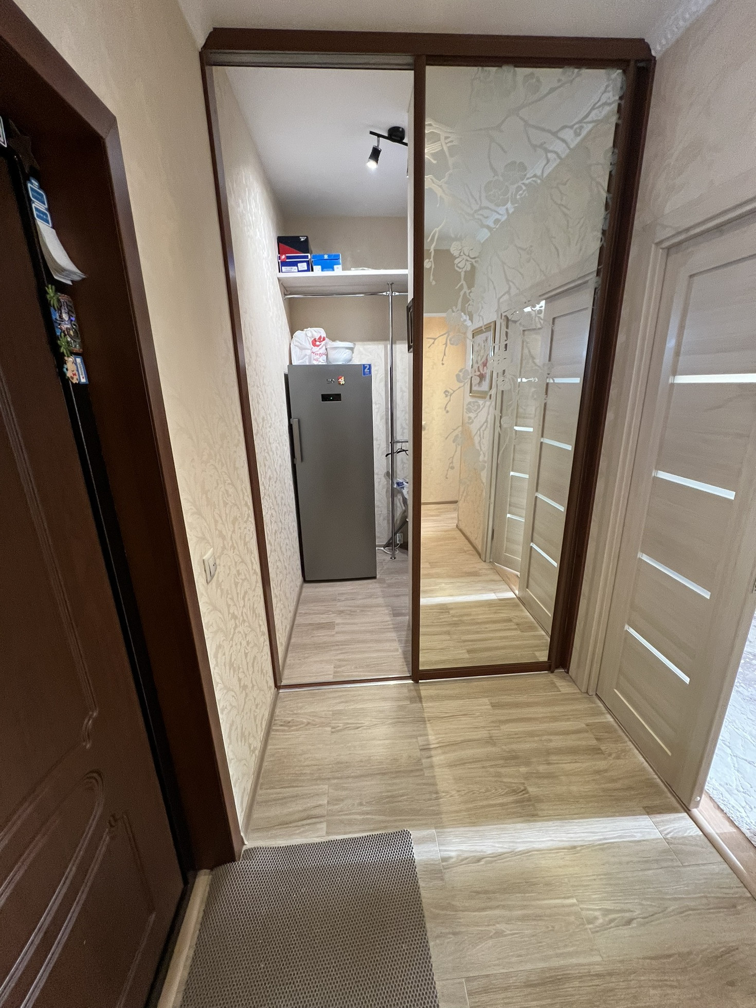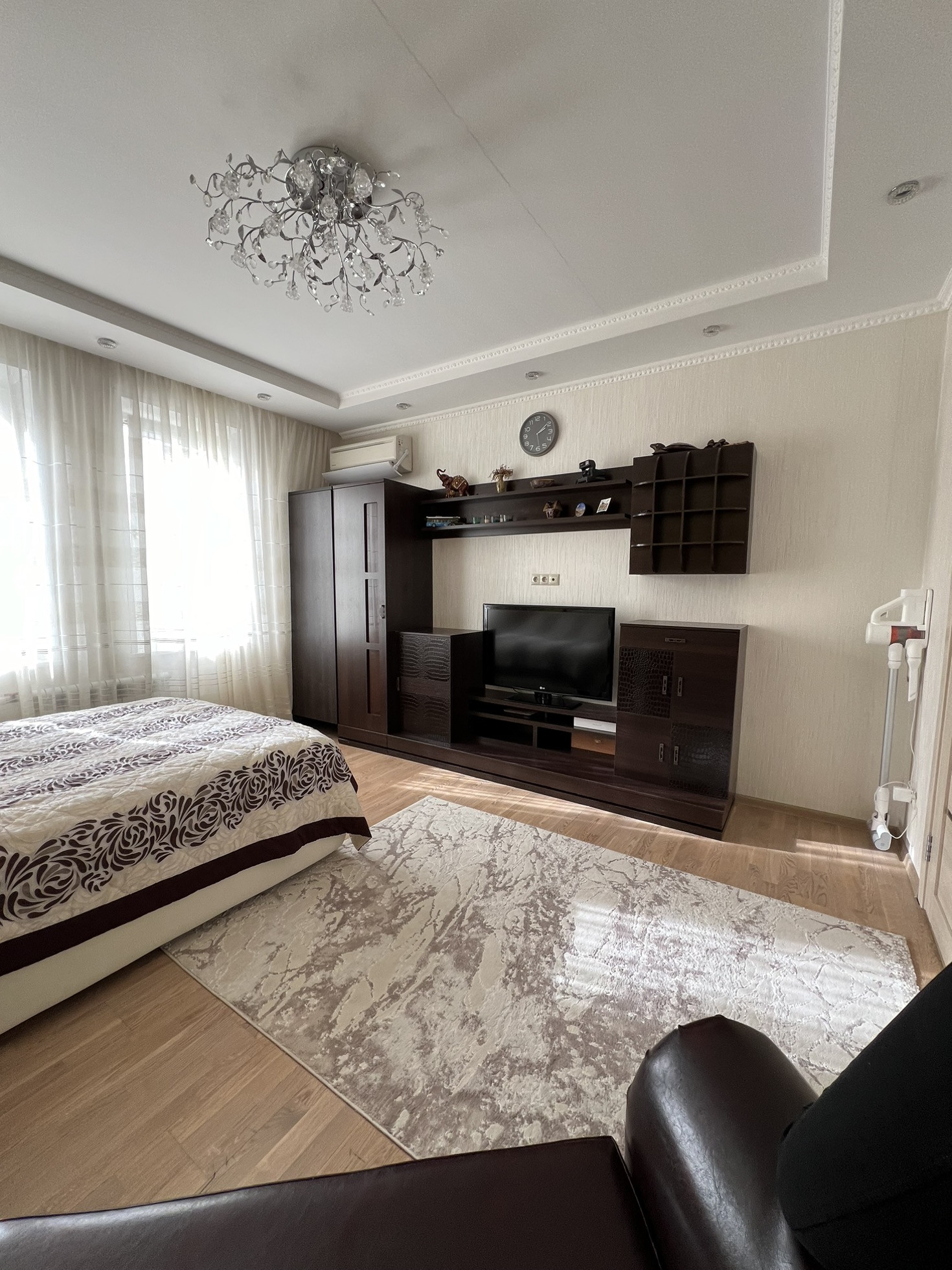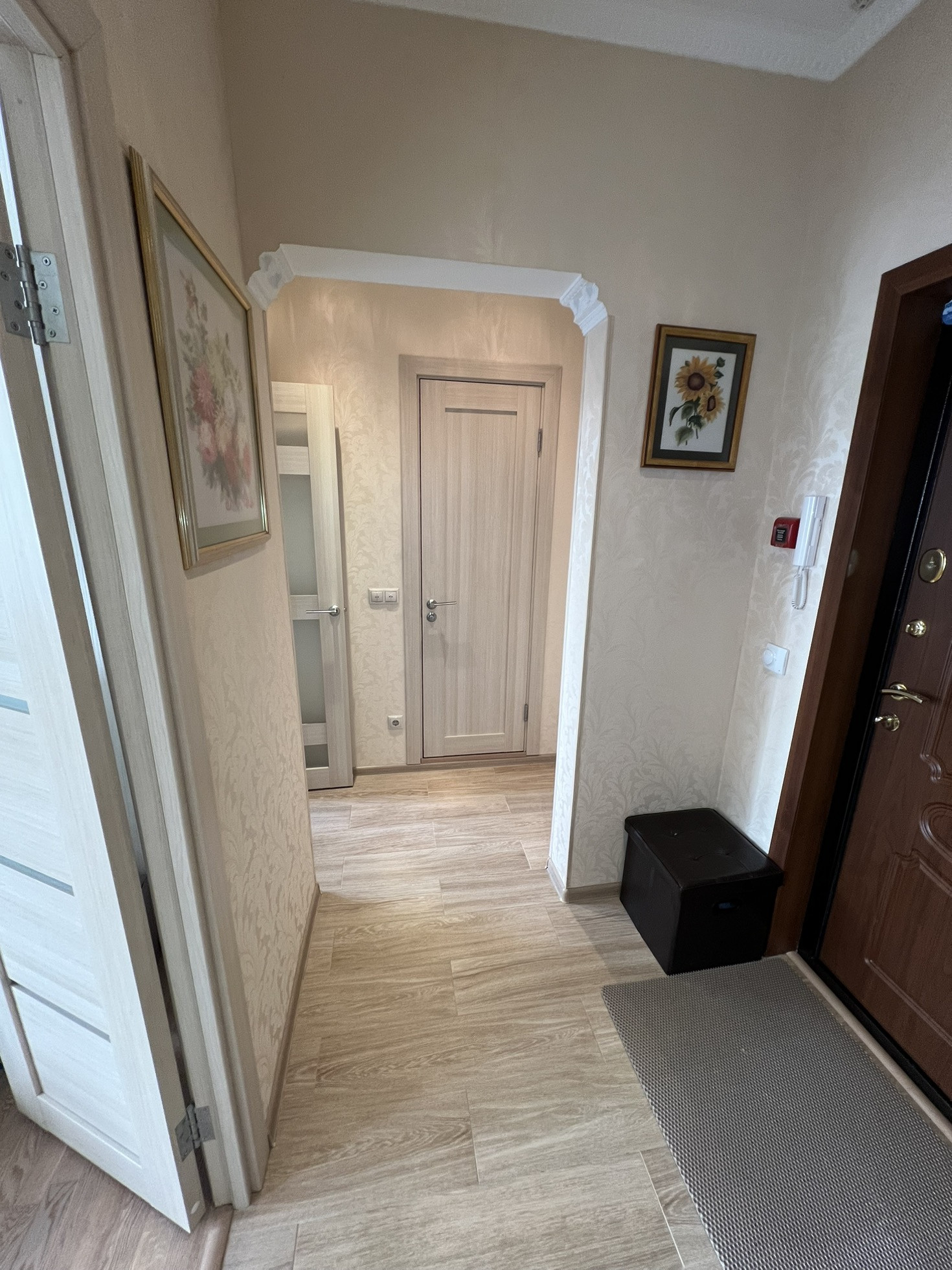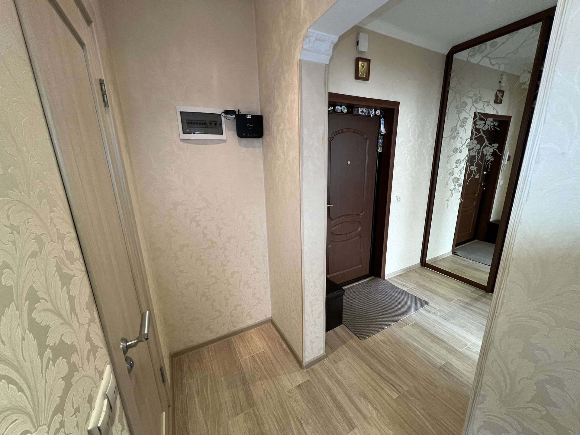 - Пол: кухня и коридор плитка с подогревом, в комнате паркетная доска;