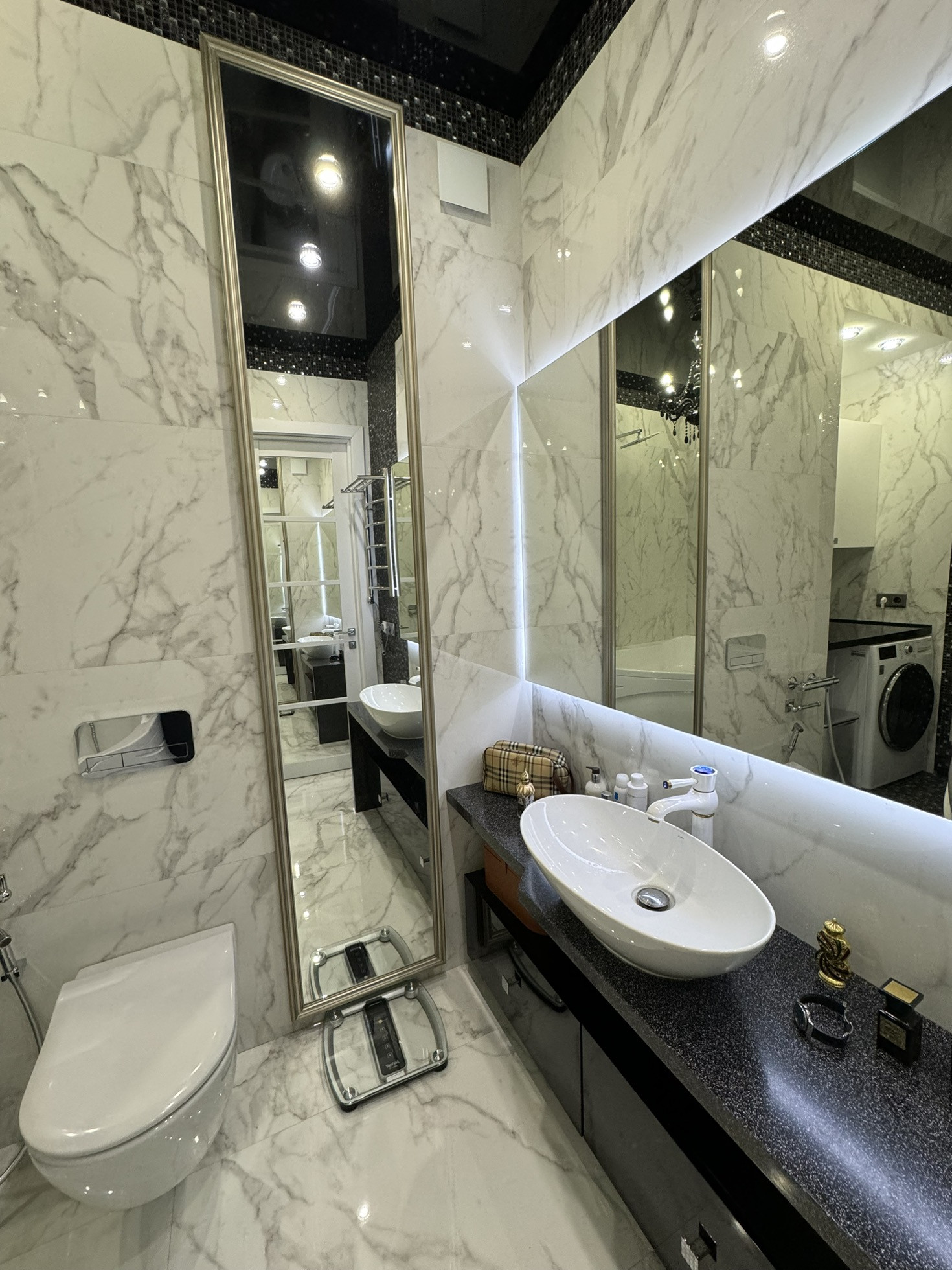 В квартире: охранная сигнализация с датчиком движения, видеодомофон, теплый пол, батареи с регулировкой (платим за отопление 600 в месяц), WiFi, стиральная машина с функцией сушки и очистки паром, гигиенический душ, большая ванна, туалет и инсталляция Villeroy&Boch, столешница и мойка на кухне и ванной сделаны на заказ из искусственного камня, пол и стены в ванной сделаны из широкоформатного керамогранита