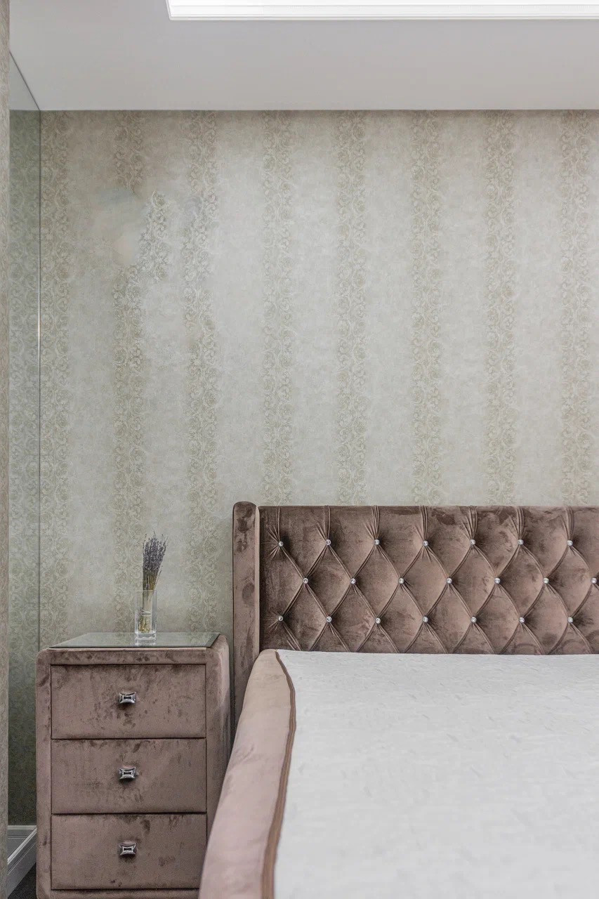 Гостиная: диван выполнен на заказ по индивидуальным размерам со спальным местом на фабрике в Португалии, зеркальная консоль, обои Versace, телевизор Samsung со смарт ТВ