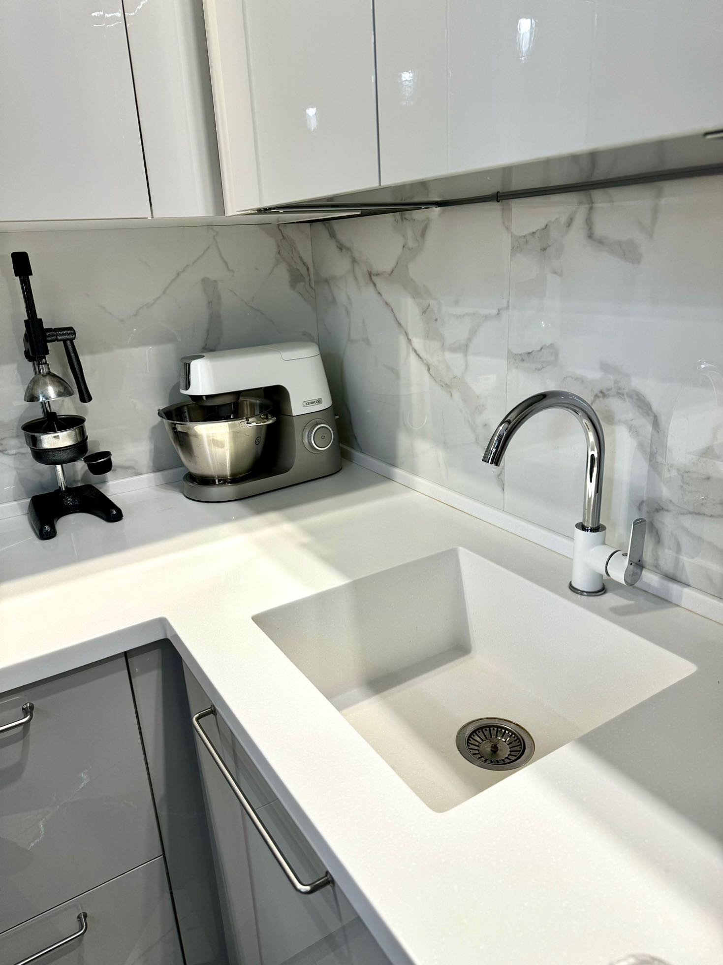 На кухне имеется вся необходимая техника: встроенные микроволновая и духовая печь, посудомоечная машина, вытяжка, кондиционер Mitsubishi, холодильник, электрическая плита, керамогранит на полу, столешница и раковина из искуственного камня, дизайнерский круглый стол на 4 персоны