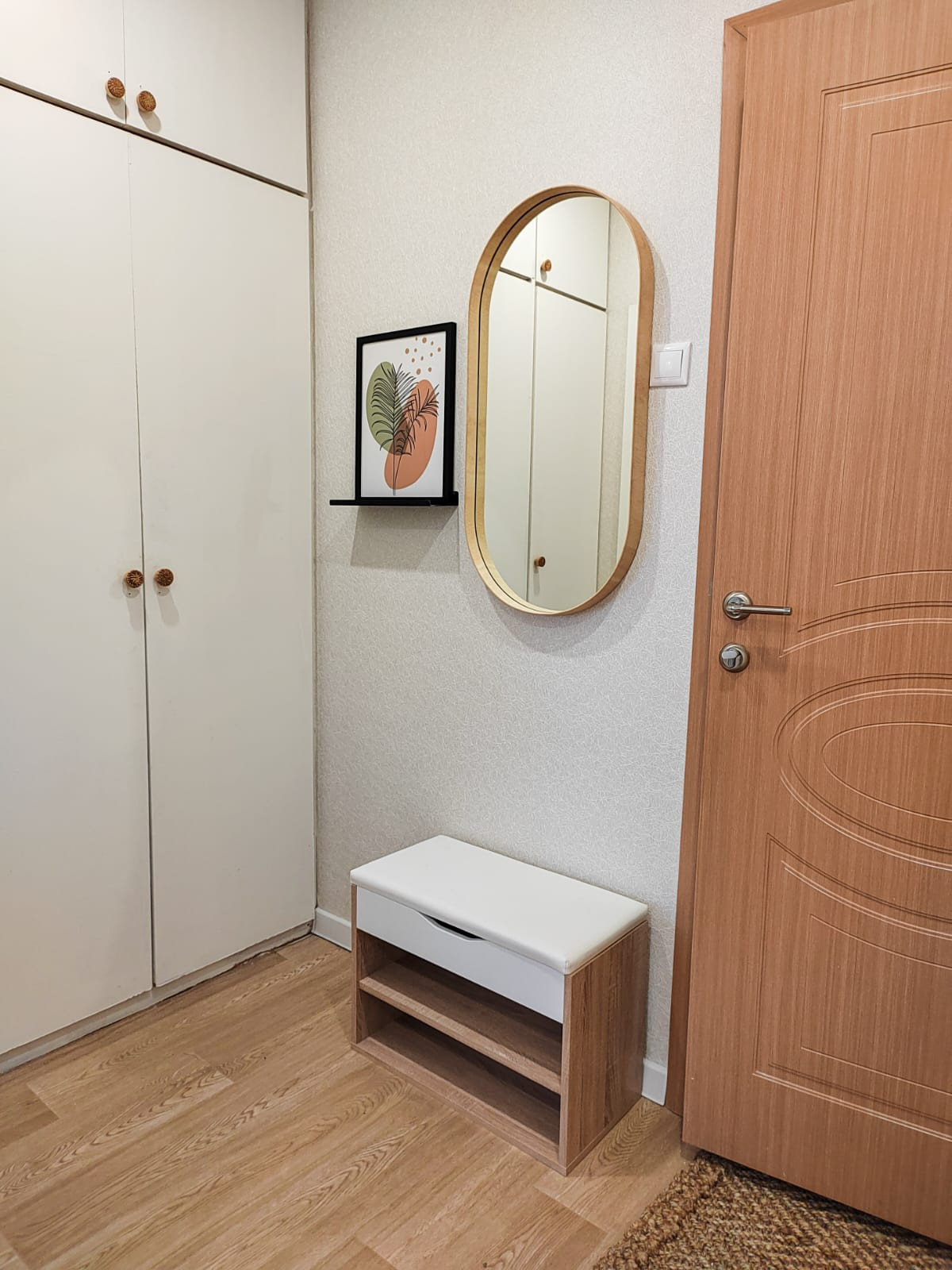 Необычная планировка позволяет выделить в комнате спальную зону, зону отдыха, место для работы. Полутороспальная кровать с качественным матрасом в алькове имеет атмосферное вечернее освещение. Зоны хранения включают встроенный шкаф в прихожей и шкаф в гостиной.