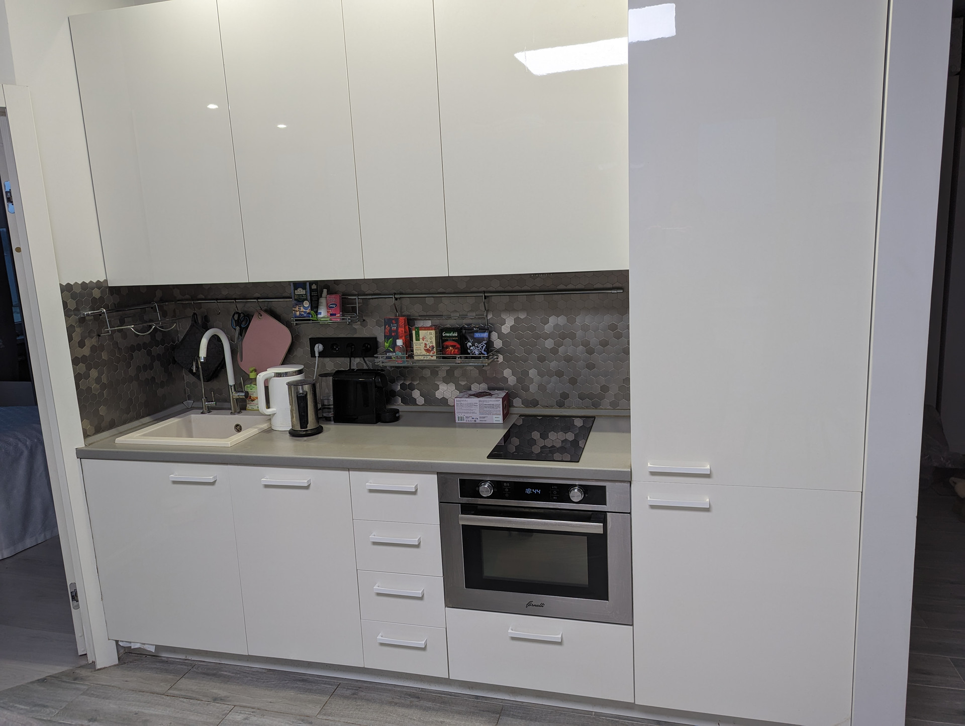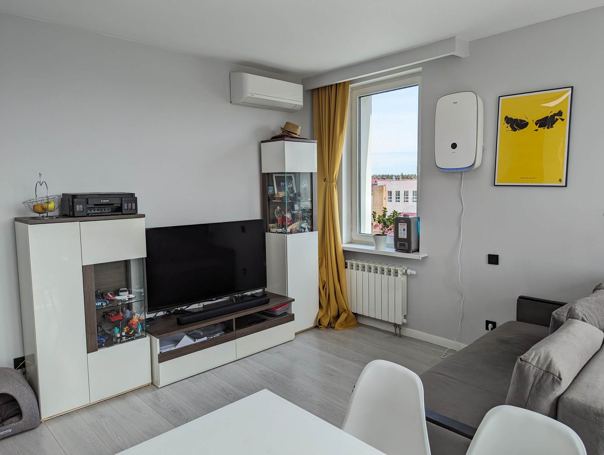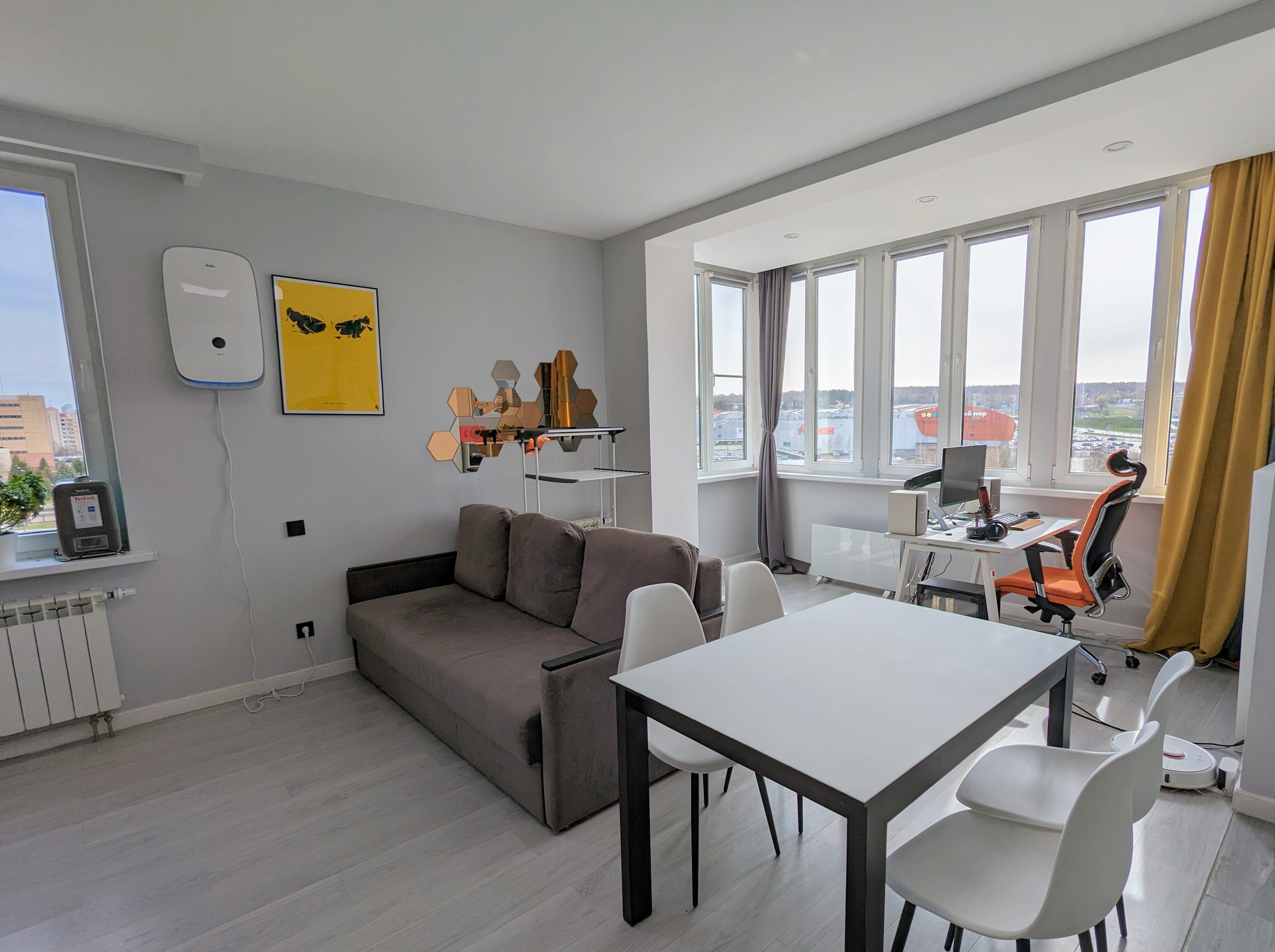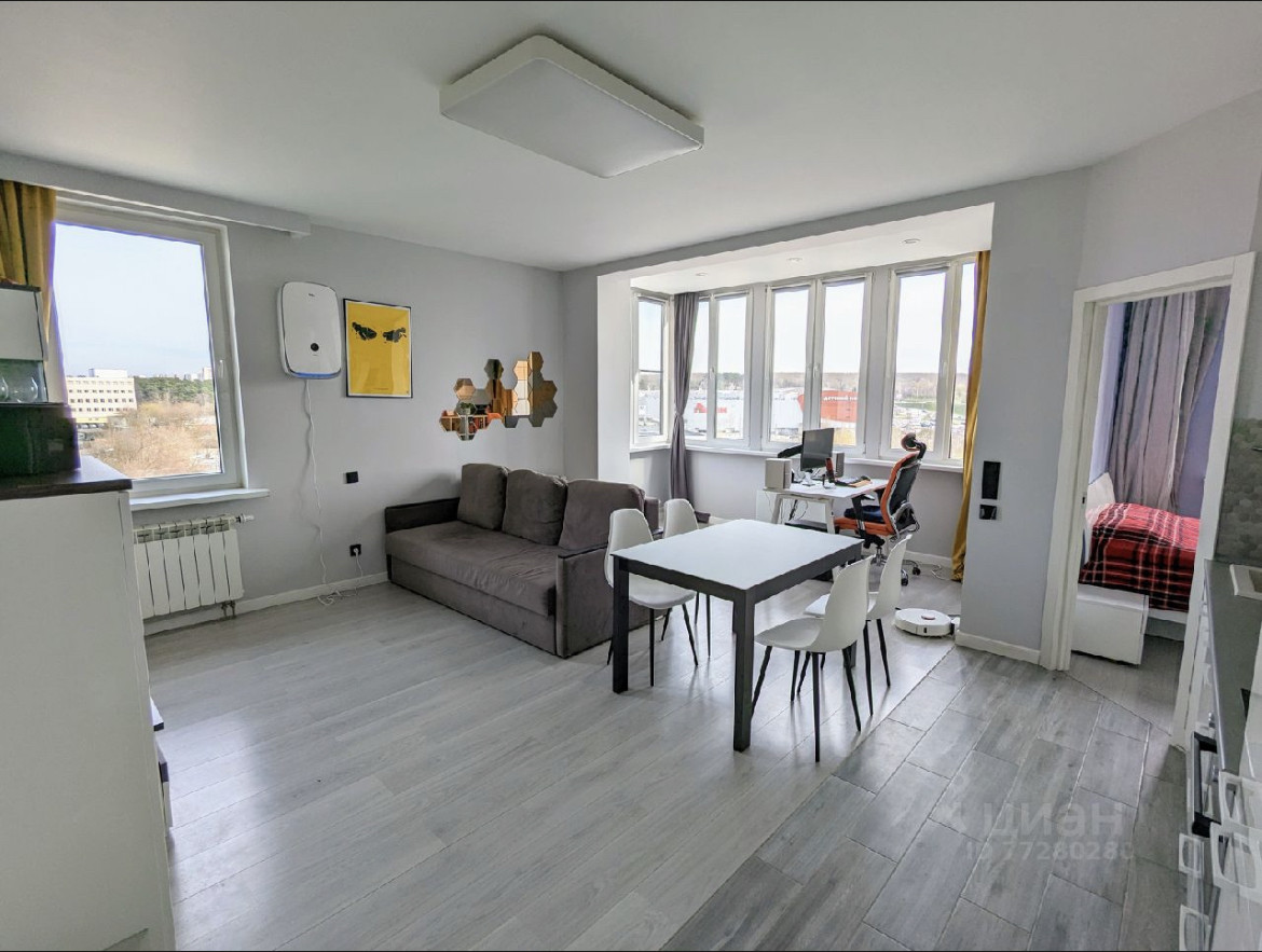 Квартира с качественным евроремонтом. Большая светлая кухня-гостиная с панорамным остеклением и отдельная спальня. Установлено два кондиционера и бризер, который очищает воздух от лишних примесей, включая аллергены. Сделана шумоизоляция стен, пола и потолка, а также четыре розетки под интернет. Кухонный гарнитур со встроенной техникой, включая посудомойку и духовку со встроенной микроволновкой, есть фильтр для воды. Совмещенный санузел с сантехникой Grohe, установлен аква-стоп.