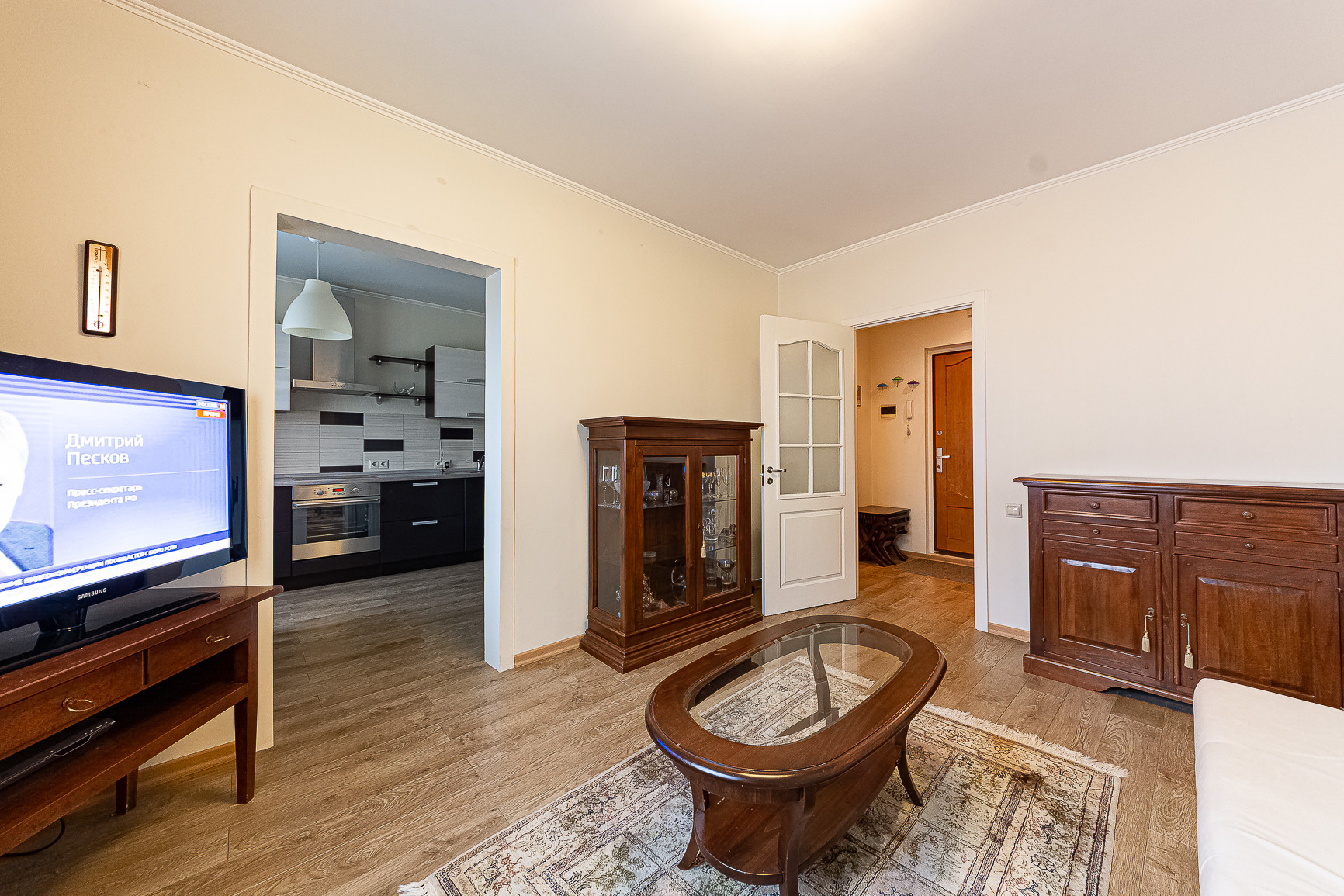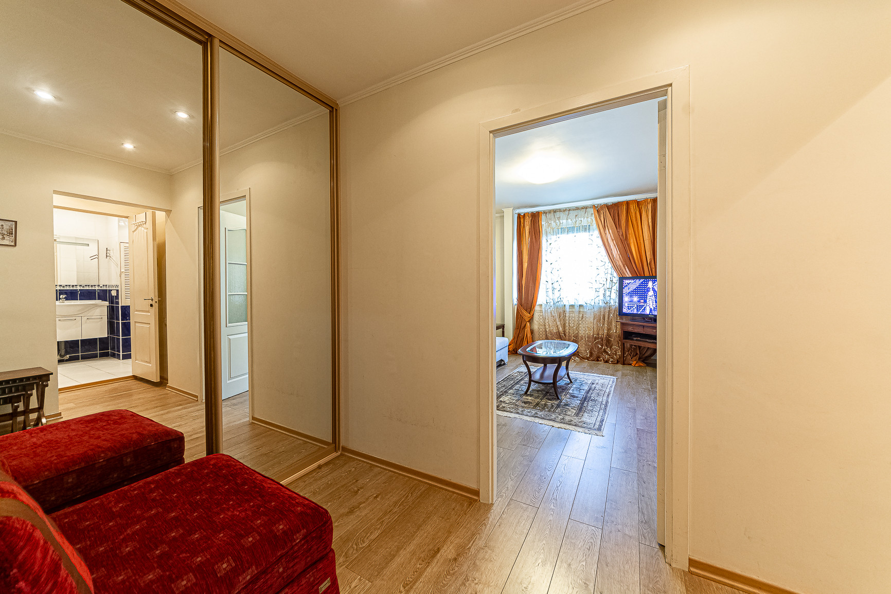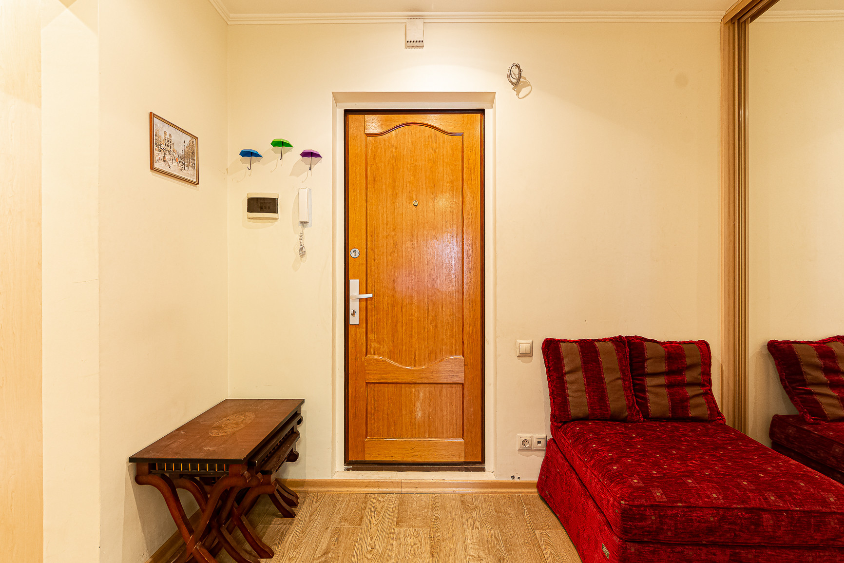 В коридоре два встроенных шкафа, в комнате итальянская мебель ручной работы и новый диван. Итальянская мебель не входит в стоимость.