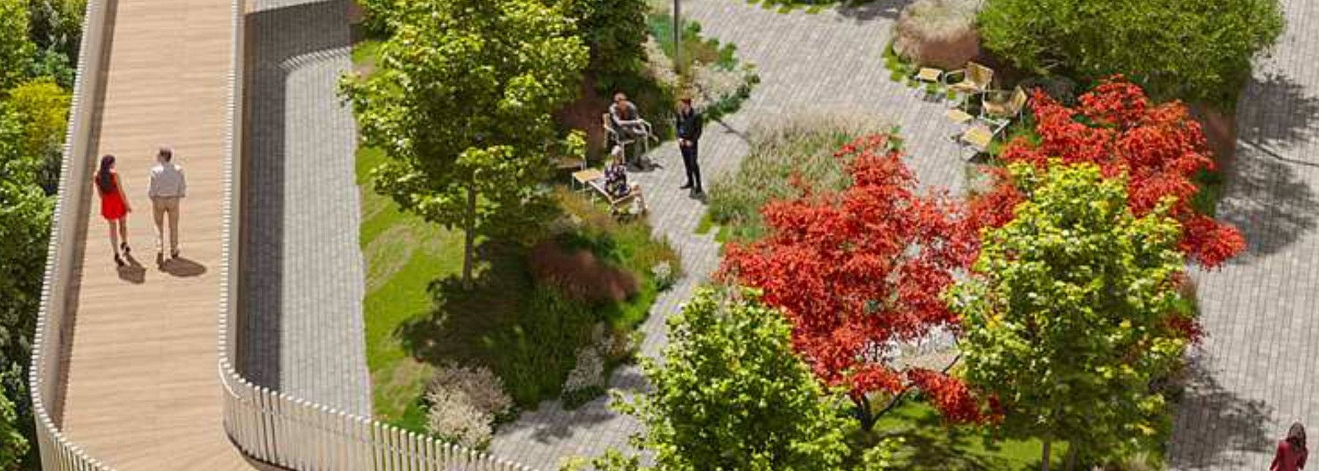 Пешеходный мост делит пространство на разные зоны: большой игровой комплекс для детей, амфитеатр, комфортное рабочее пространство, лаундж-зоны, игровые площадки. Под мостом будут расположены разнообразные качели и гамаки.