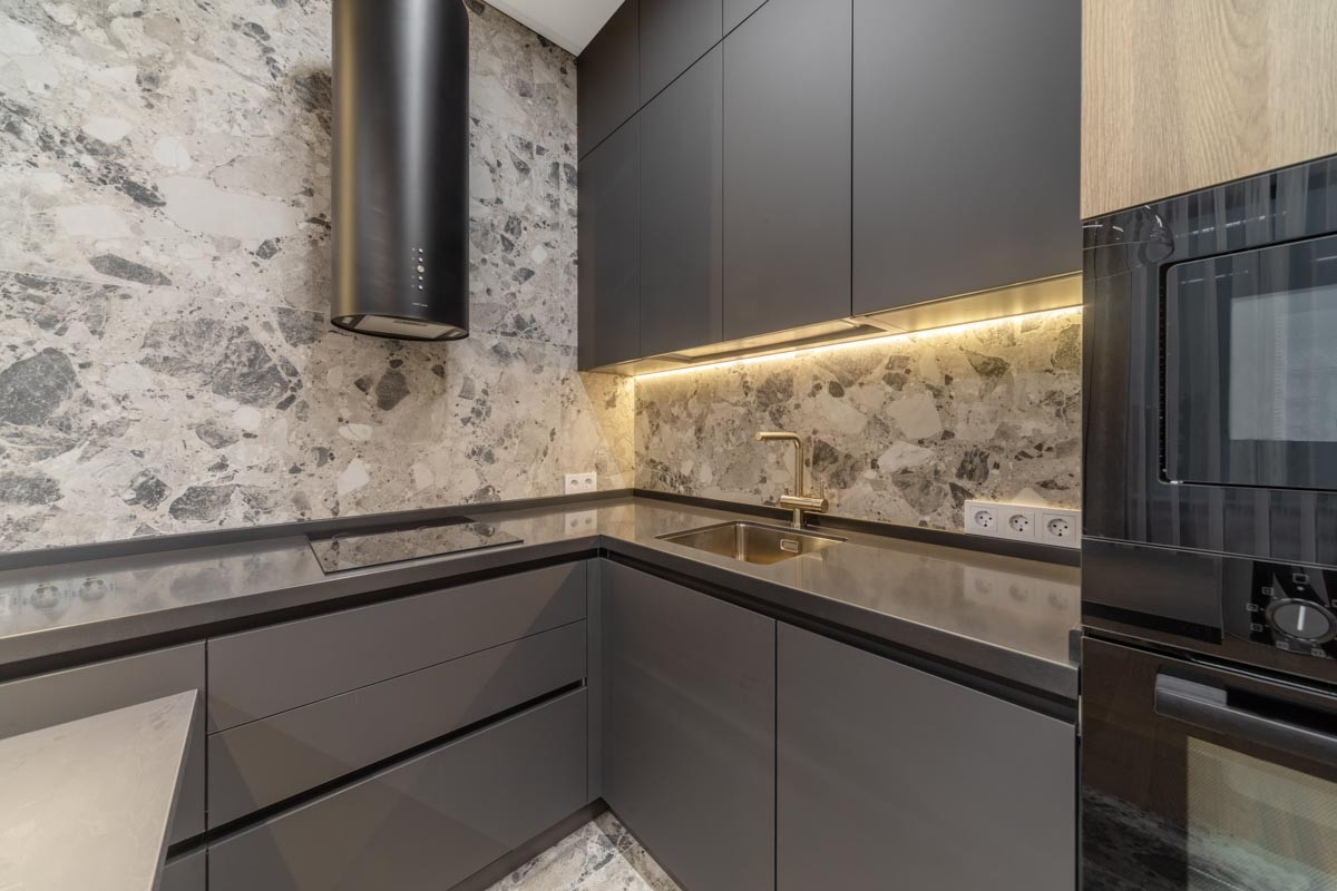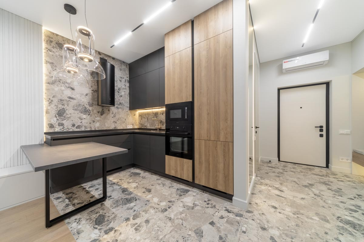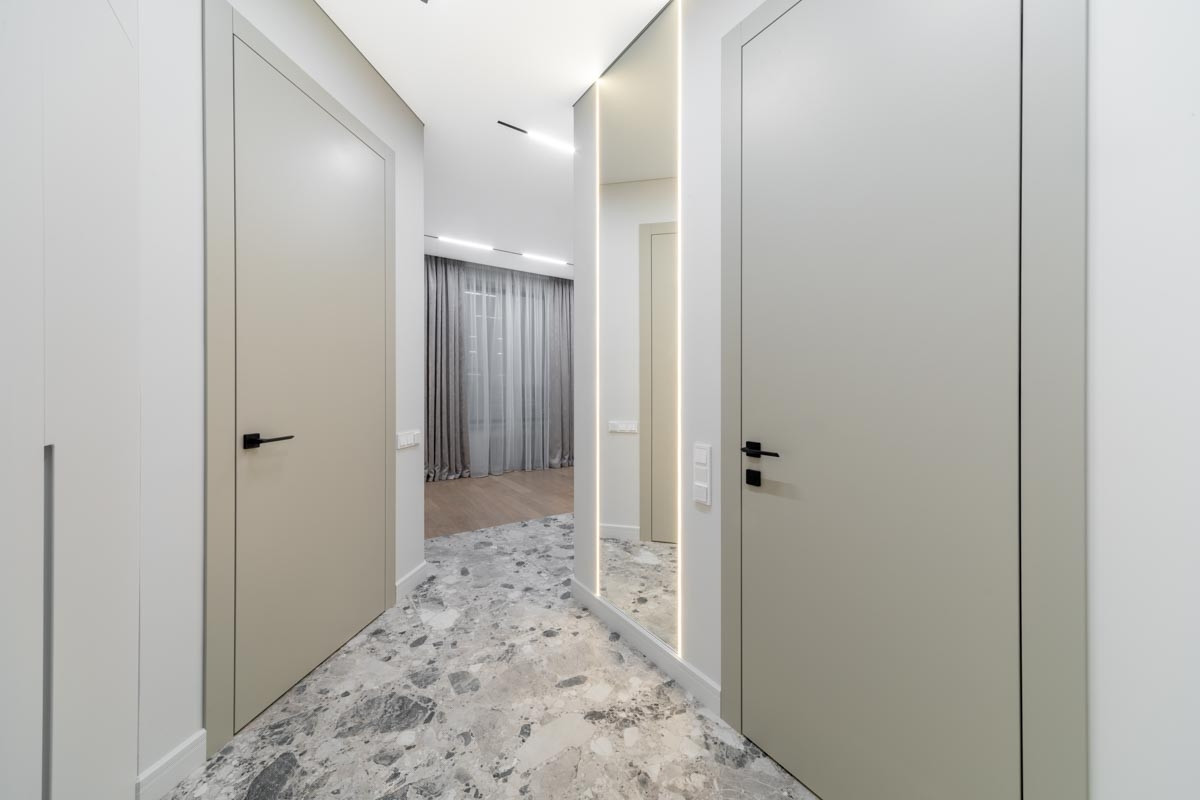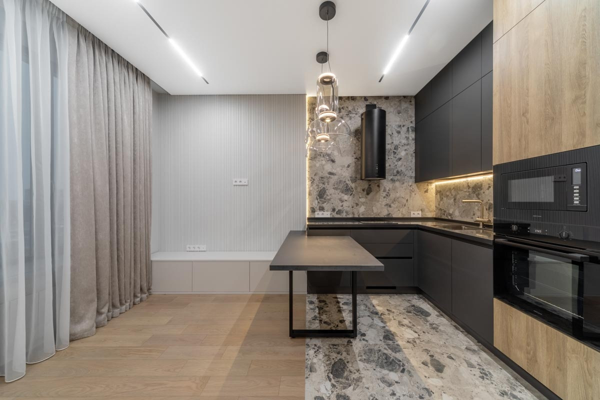 В отделке квартиры использованы дорогостоящие материалы, включая натуральный камень, из которого сделаны все подоконники и столешница. Дизайн оформлен в теплых песочных тонах, для наполнения пространства атмосферой уюта и безопасности.