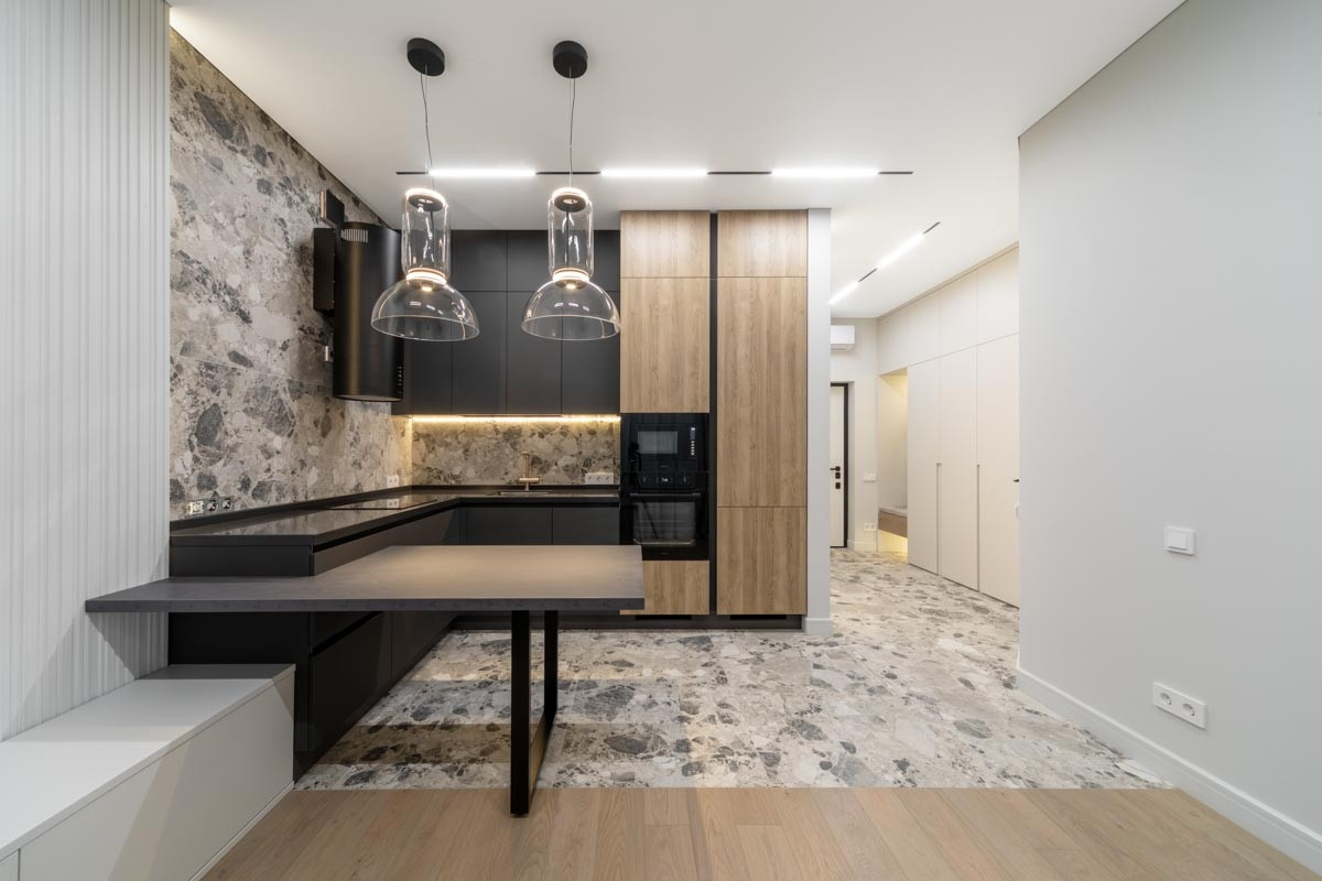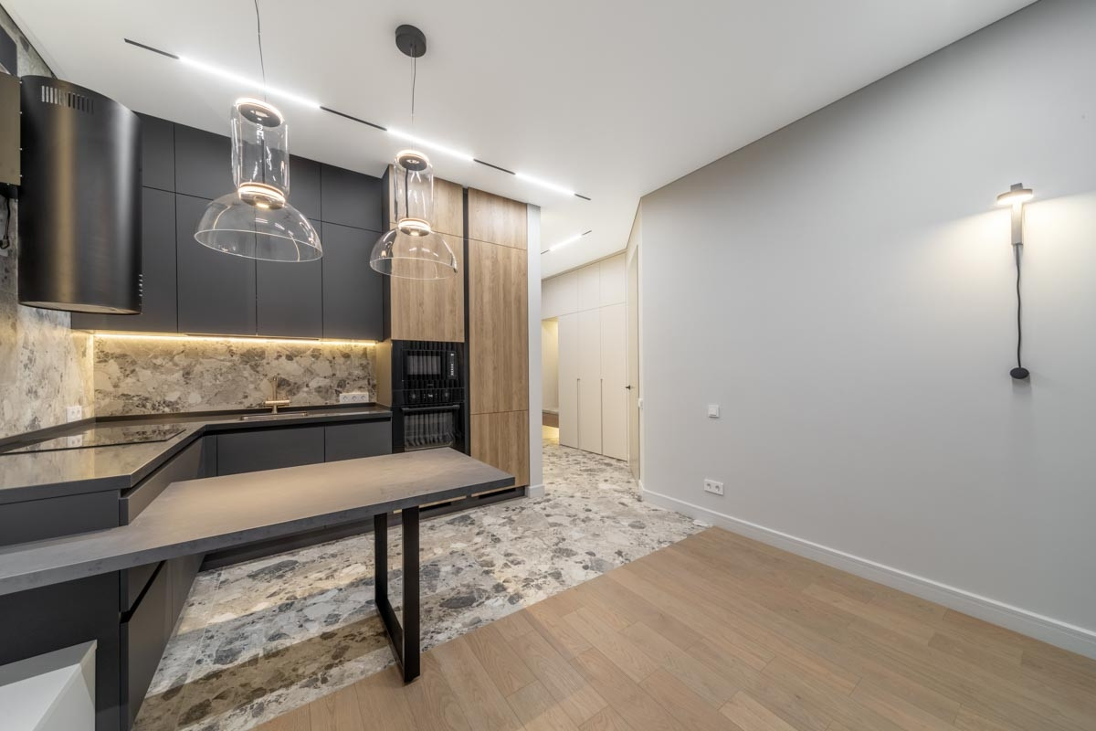 Квартира спланирована максимально функционально: кухня-гостиная 25 метров с продуманным зонированием обеденной зоны и пространства для уютного отдыха.