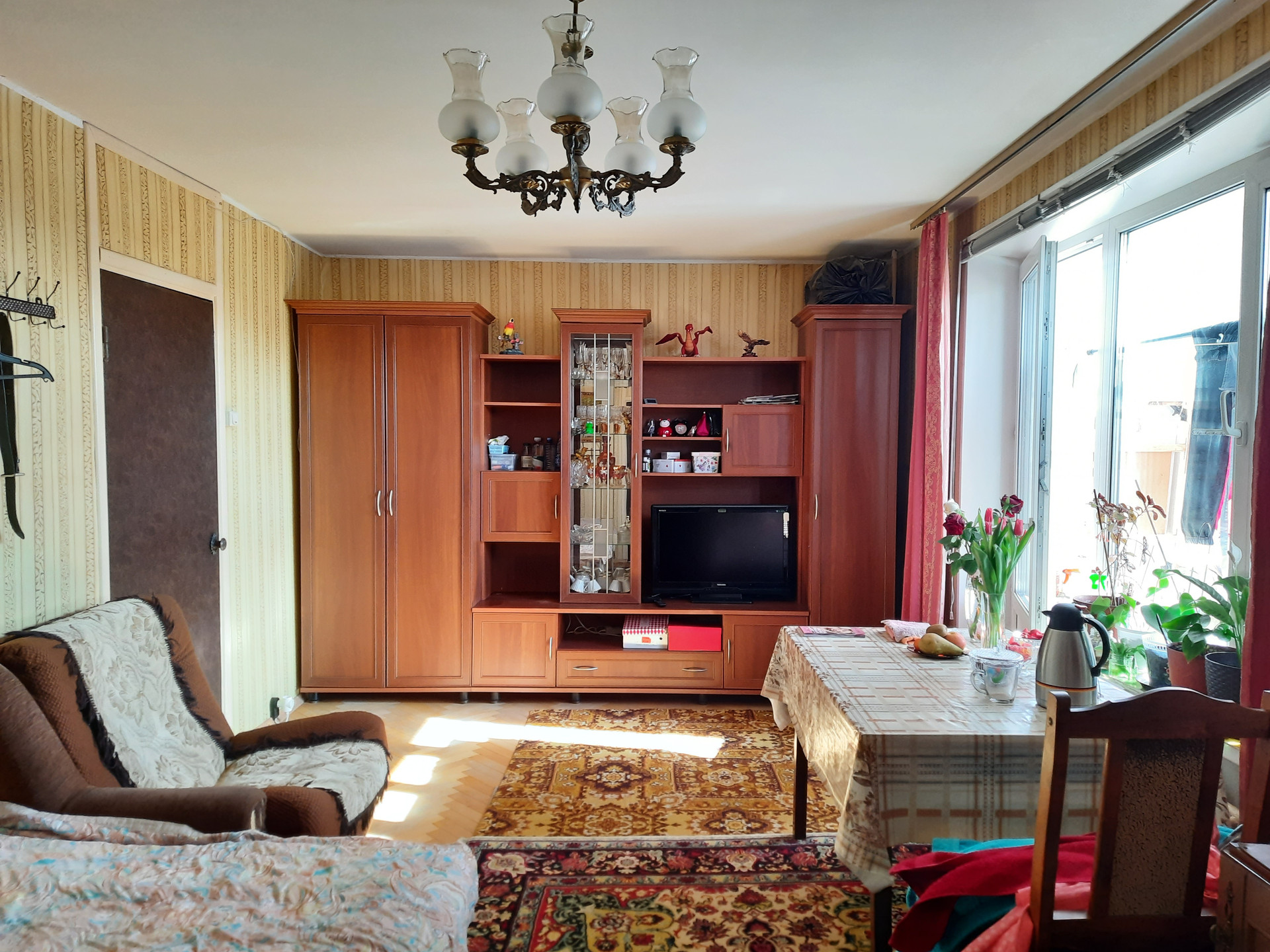 Светлая трехкомнатная квартира с ДВУМЯ застекленными БАЛКОНАМИ и раздельным санузлом. Окна выходят на ТРИ стороны. На полу паркет из натурального дерева, на стенах - обои.
