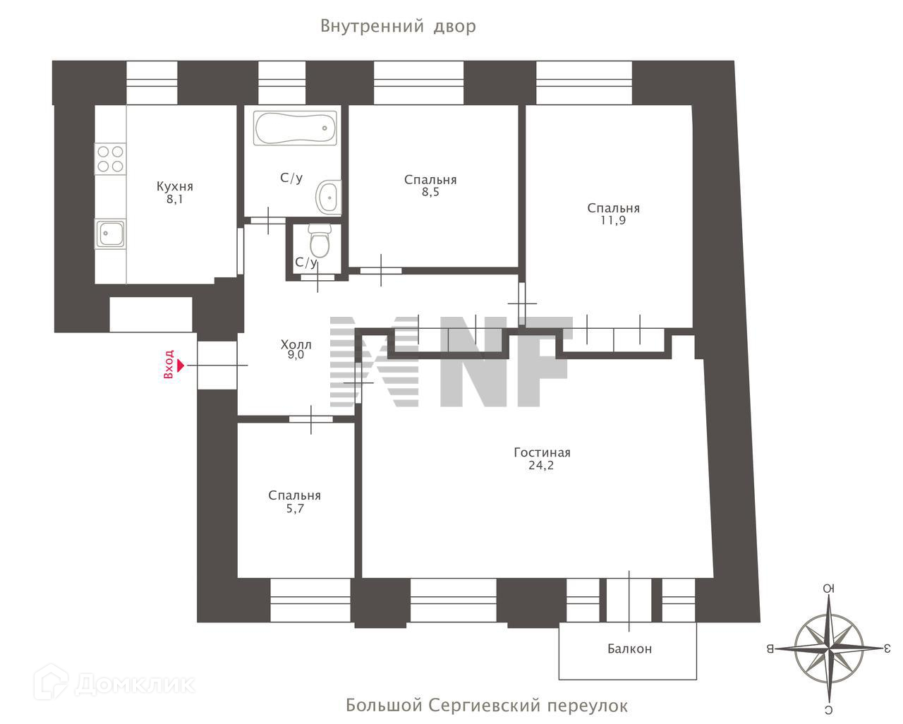 Окна выходят на 2 стороны: в Большой Сергиевский переулок и во двор.