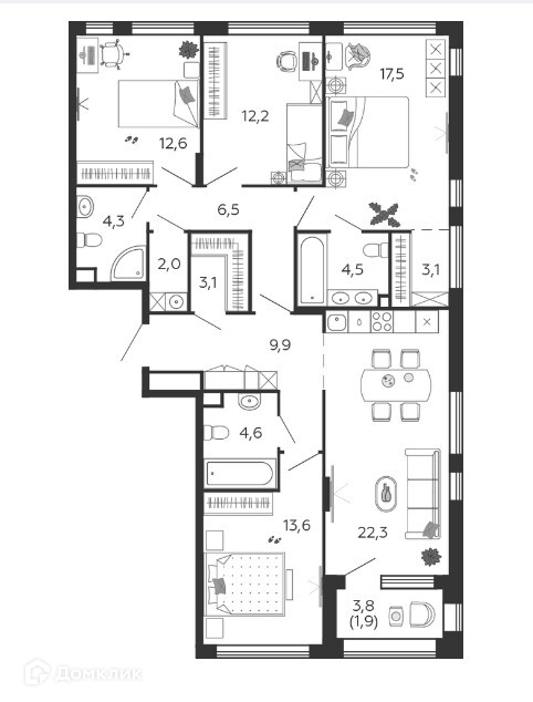 - В квартире есть три санузла и возможность создания постирочной комнаты.