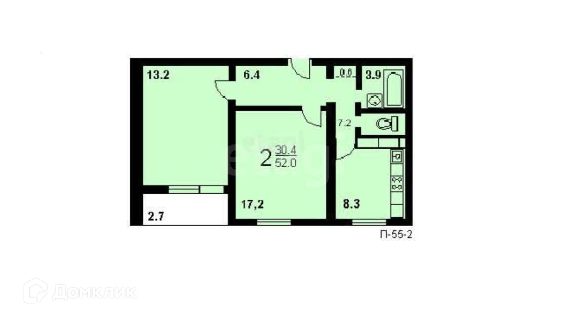 Общая площадь 52.2 м2